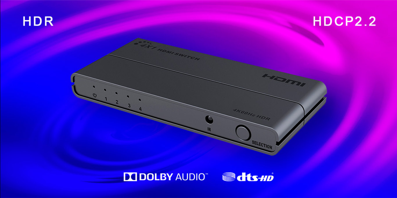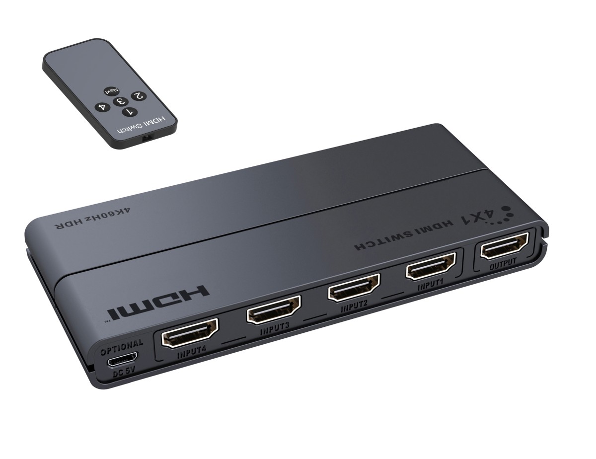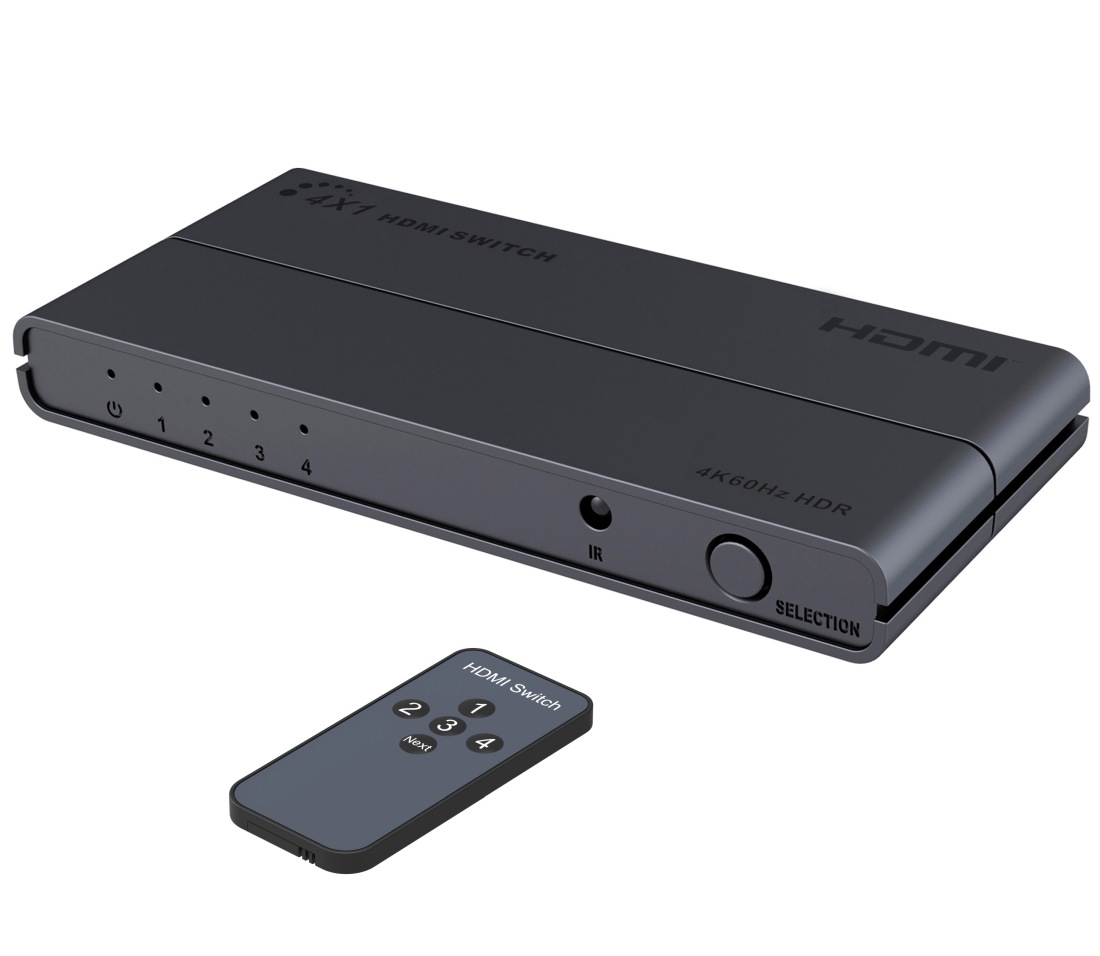 PremiumCord HDMI switch 4:1 s podporou rozlišení 4Kx2K@60Hz, 1080P, HDR, s ovládáním tlačítkem a dálkovým ovladačem