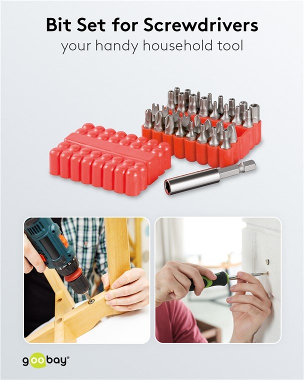 obsah setu: 1 ks. Držák magnetických bitů 6,35 mm 12 ks Hexagonální bity (2; 2,5; 3; 4; 5; 6; 1/8; 3/32; 5/32; 5/64; 7/64; 9/64); 4 ks. Trojkřídlé bity (1-2-3-4); 3 ks. Bity Philips (6-8-10); 4 ks. Speciální bity (4-6-8-10); 9 ks. Torxové bity s otvorem (T8, T10, T15, T20, T25, T27, T30, T35, T40)