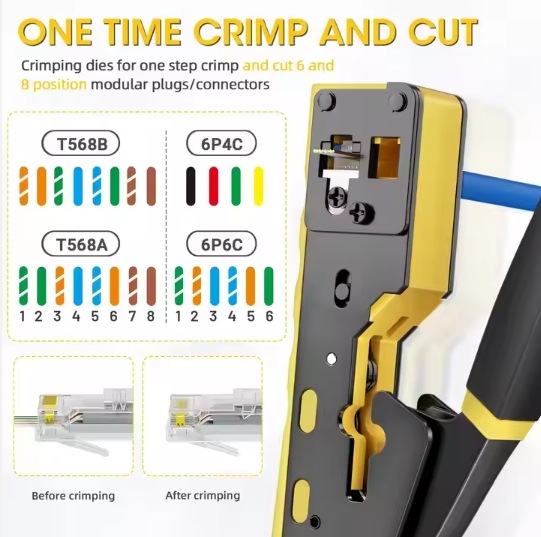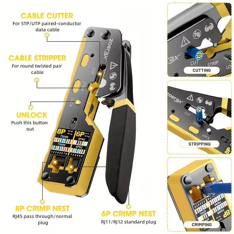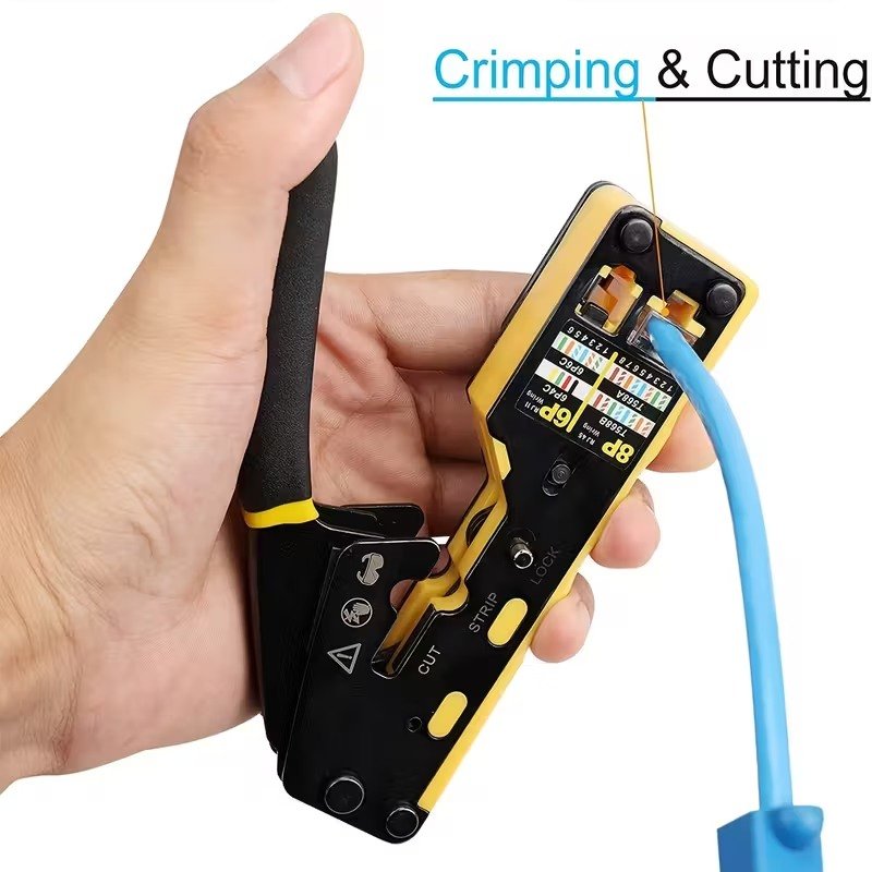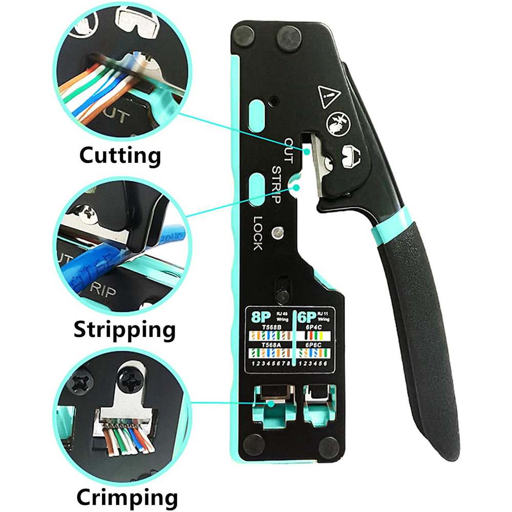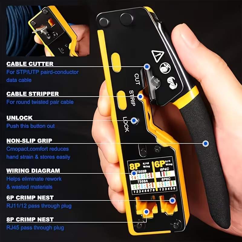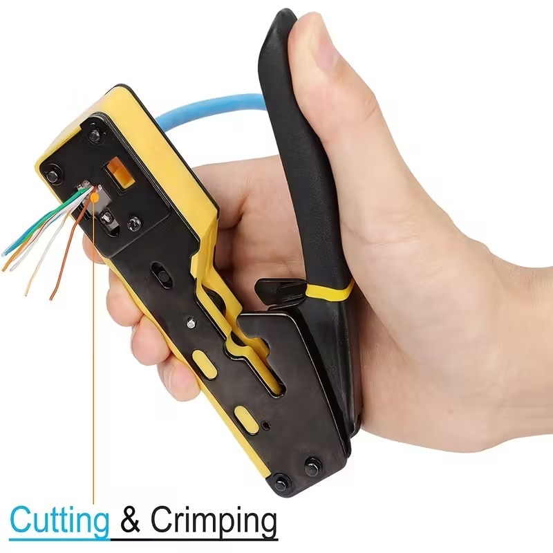 - Praktický krimpovací nástroj 3 v 1 pro stříhání, odizolování a spojování síťových kabelů s modulárními zástrčkami RJ45.