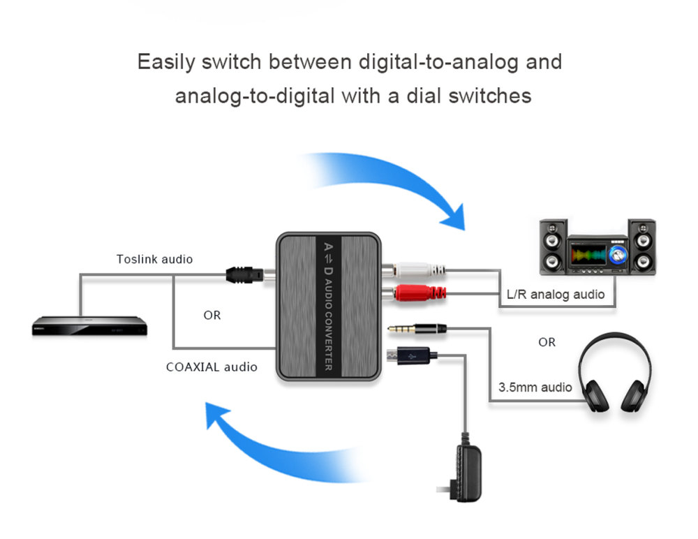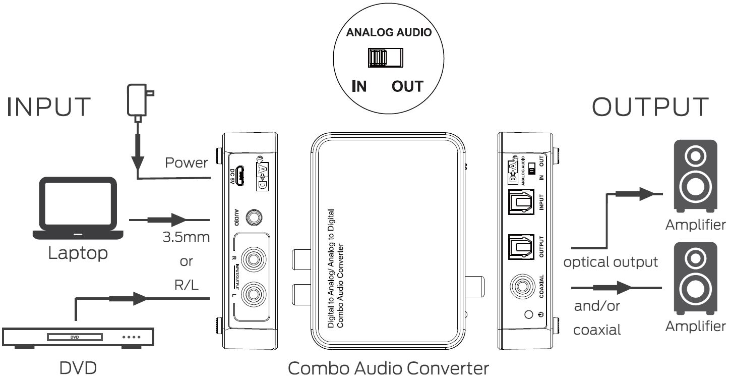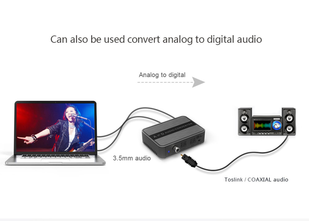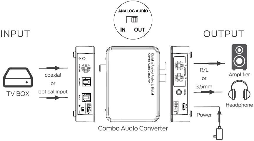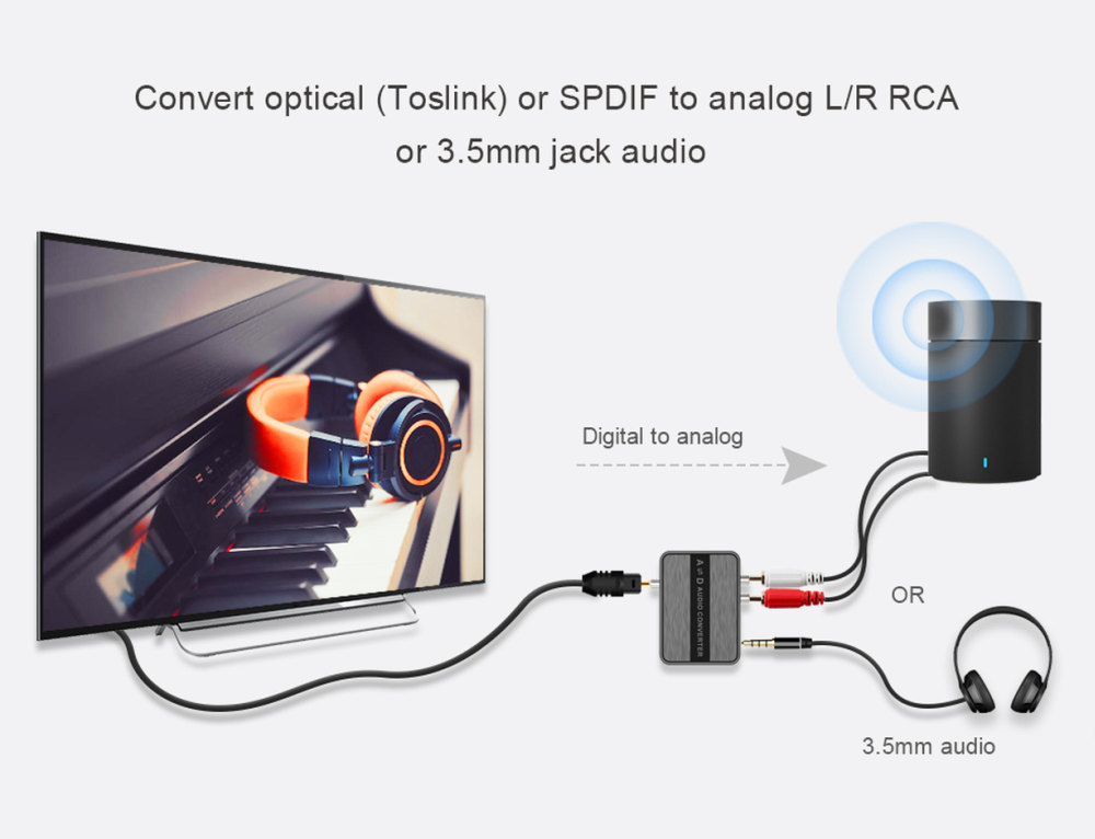1) D-A převádí digitální signál (coaxial SPDIF ) nebo optický ( Toslink ) na analogový stereo signál 2x CINCH a stereo jack 3,5mm
