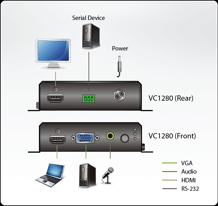 ATEN VC1280 je uživatelsky přívětivé zařízení, které jednoduše propojuje zdroje HDMI a VGA s jedním displejem nebo projektorem HDMI. VC1280 je kompatibilní s HDCP 1.4 a podporuje také HDMI 1.4 včetně 3D,