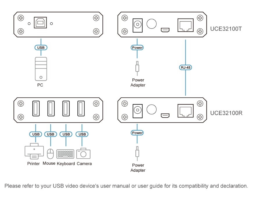 Napájecí zdroj na dálkovém zařízení UCE32100 pomáhá poskytovat dostatek energie jakémukoli typu zařízení USB, jako jsou klávesnice, klávesnice, myši, webové kamery, skenery nebo tiskárny atd.
