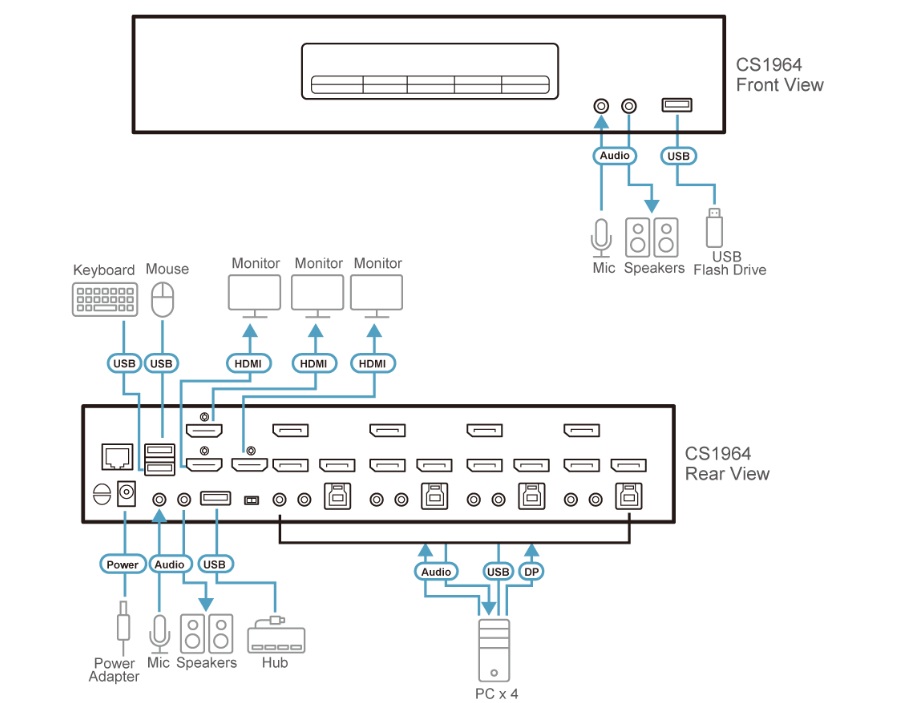 poskytuje okamžitý a uživatelsky přívětivý přístup ke čtyřem počítačům prostřednictvím jediné klávesnice USB, myši USB a až tří monitorů HDMI. Po sestavení dvou kusů CS1964 do kaskády