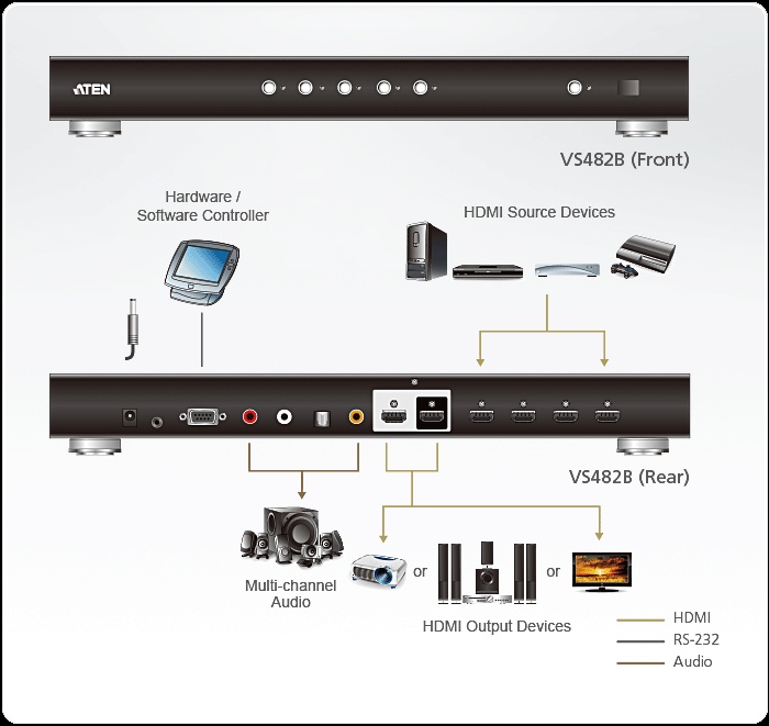 Navíc VS482B nabízí způsoby přepínání mezi zdroji HDMI pomocí tlačítek na předním panelu, IR dálkového ovládání a příkazy RS-232,