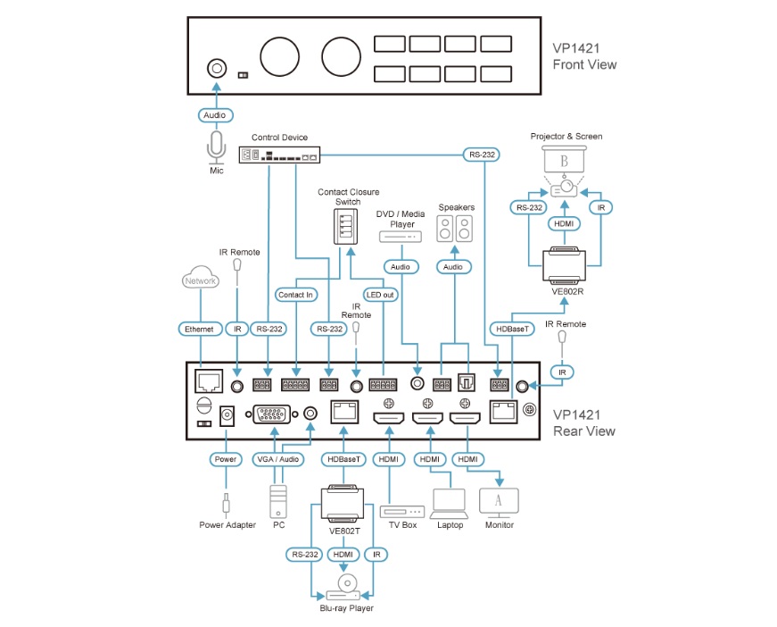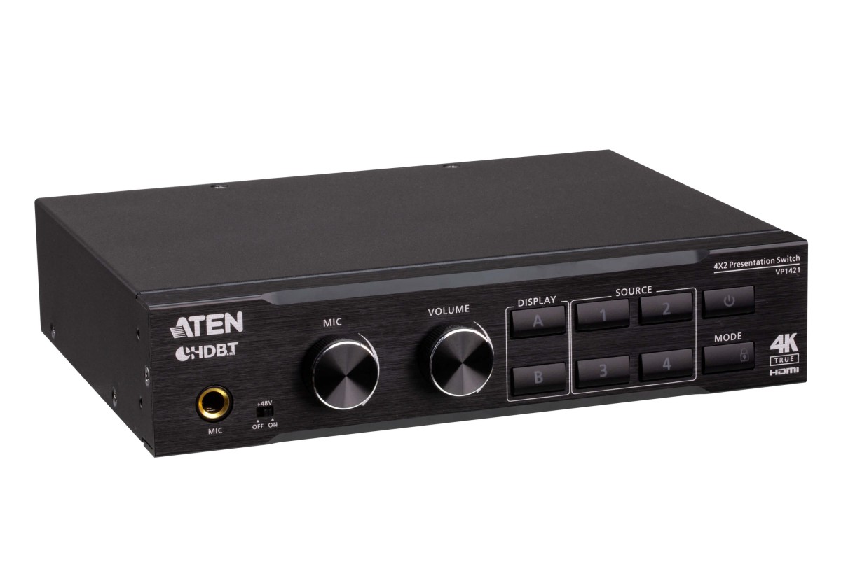 ATEN VP1421 je prezentační přepínač multi-in-one, který integruje přepínač video matice, 4K scaler, HDBaseT extender, audio DSP a analogově-digitální převaděč do jediného kompaktního zařízení, které snadno