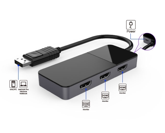 Adaptér pro připojení jednoho výstupu DisplayPort V1.4 se třemi LCD HDMI monitory. Adaptér umožní tři režimy zobrazení (extended + mirror + duplicate ) na třech monitorech. Tento adaptér umožňuje propojit DisplayPort výstup se třemi HDMI monitory a na každém zobrazovat jiný obraz.Například se dá využít k vytvoření rozšířené plochy na více monitorech viz fotografie v příloze jako příklad použití.