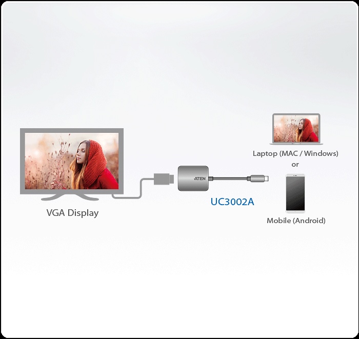 UC3002A je adaptér USB-C na VGA, který vám umožní přenést video z vašeho notebooku, tabletu, počítače nebo smartphonu vybaveného USB-C na VGA displej nebo projektor. UC3002A podporuje vysoké rozlišení videa až 1920 x 1200 @ 60 Hz, takže můžete pohodlně přizpůsobit výstup zobrazení většímu monitoru nebo provádět prezentace z projektoru.