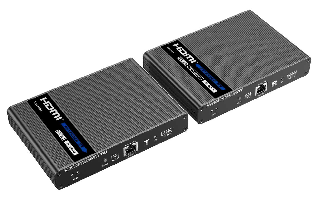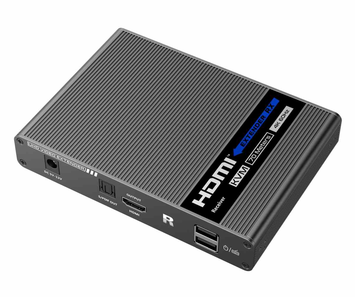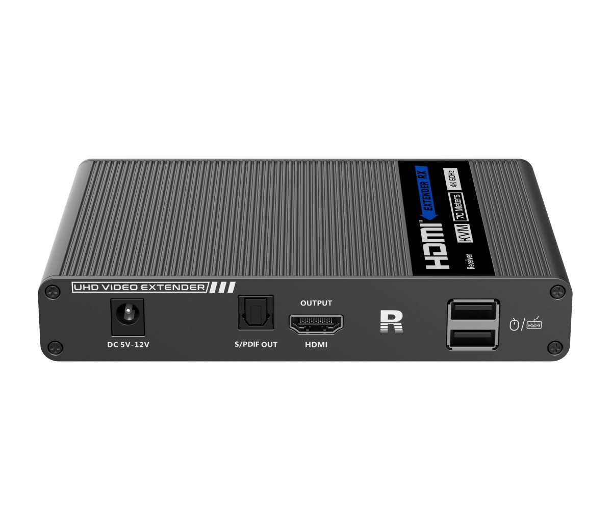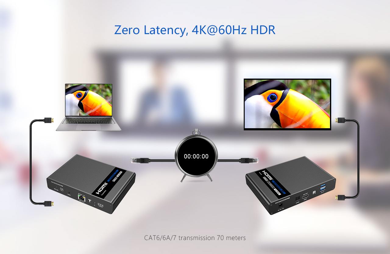 Umožňuje distribuovat HDMI signál o vysokém rozlišení 4K@60Hz bez zpoždění až na 70 metrů a přenášet zároveň USB (například klávesnici, myš nebo jiné USB periferie)