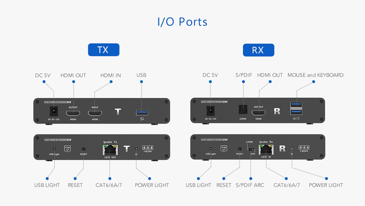 - Konektory na přijímači: HDMI výstup, 2x USB výstup, konektor RJ45 na propojení s vysílačem, napájecí konektor, S/PDIF výstup digitální audio