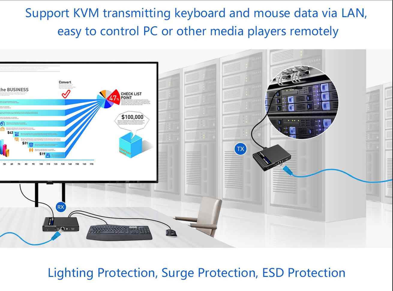 Díky použití síťového kabelu je možné dosáhnout až 70 metrů přenosové délky s rozlišením 4K@60Hz nebo FULL HD 1080p videa a přenášet zároveň USB (například klávesnici, myš nebo jiné USB periferie)