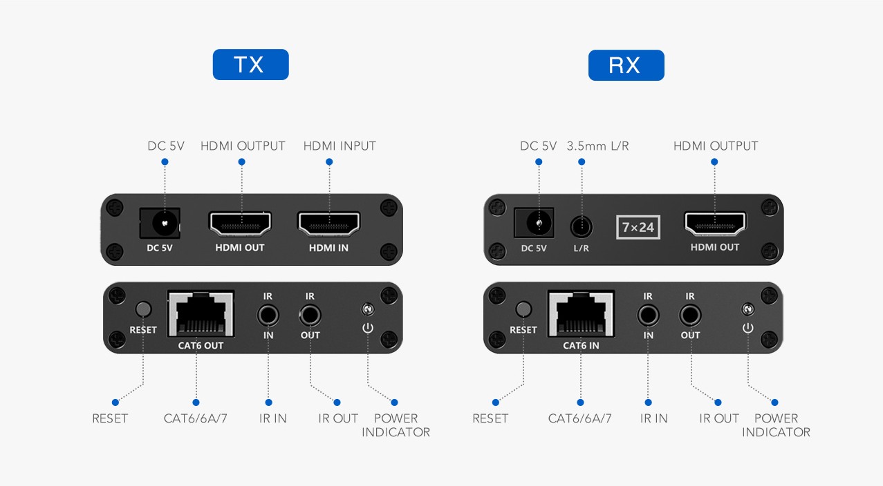 - Konektory na vysílači: HDMI vstup, HDMI výstup pro lokální monitor, konektor RJ45, napájecí konektor, 2x konektor IR