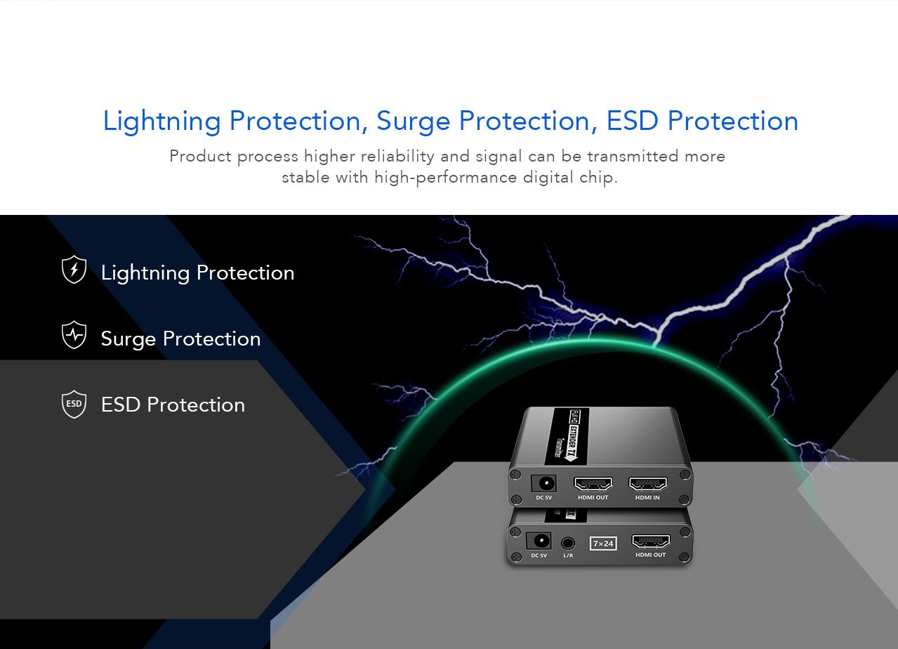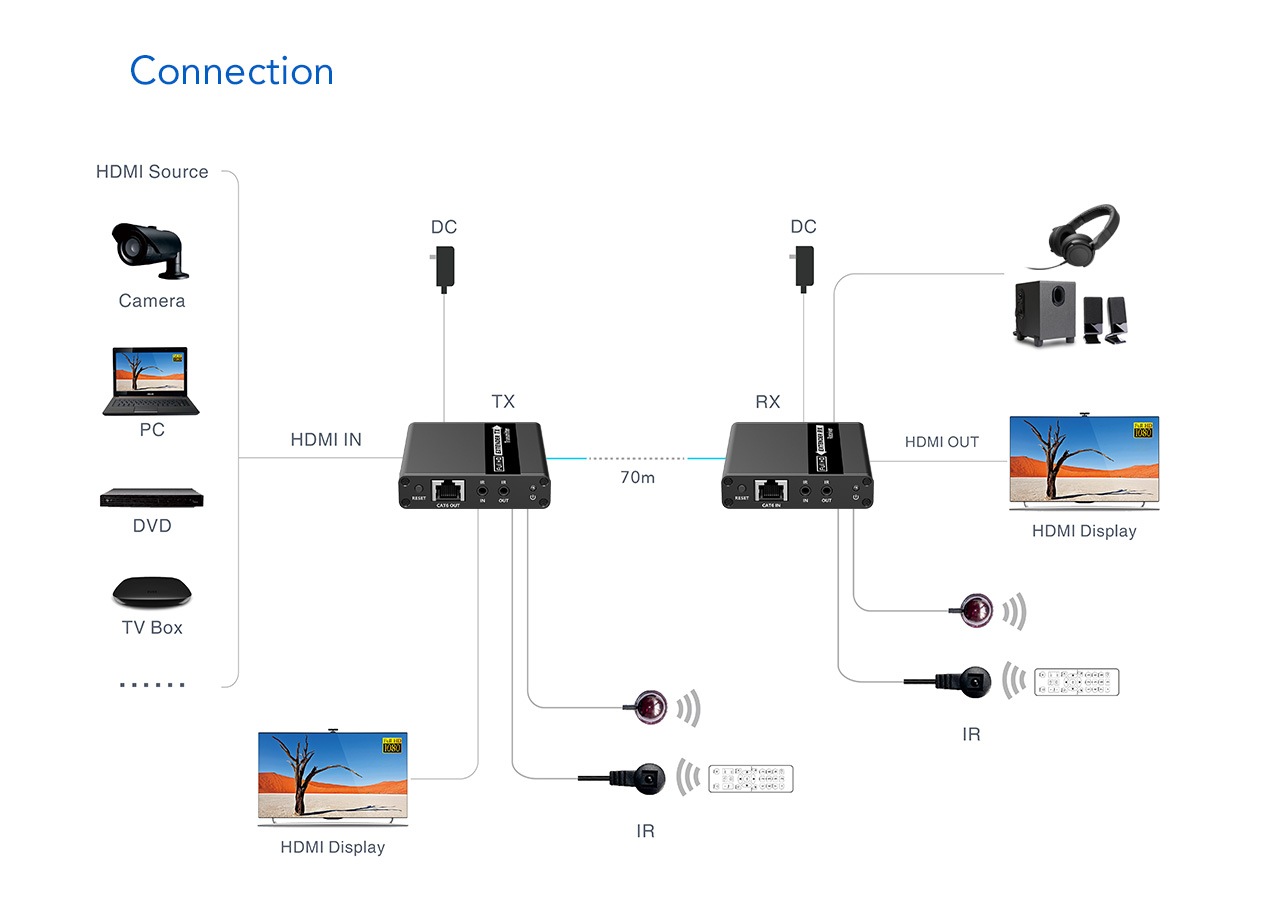 - HDMI signál lze přenášet až do 70m přes kabel Cat.6 / 6A / 7; až 40 m na kabelu Cat.5E