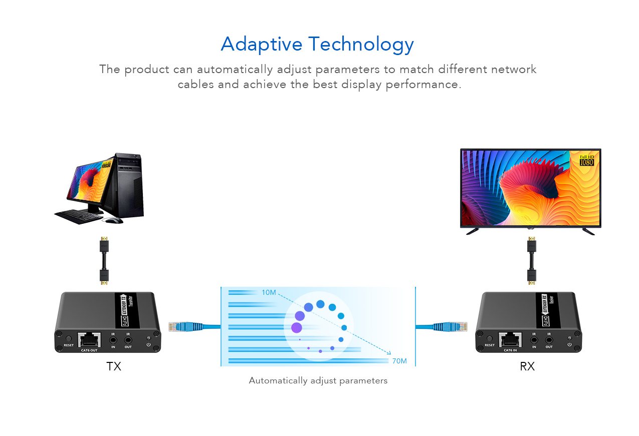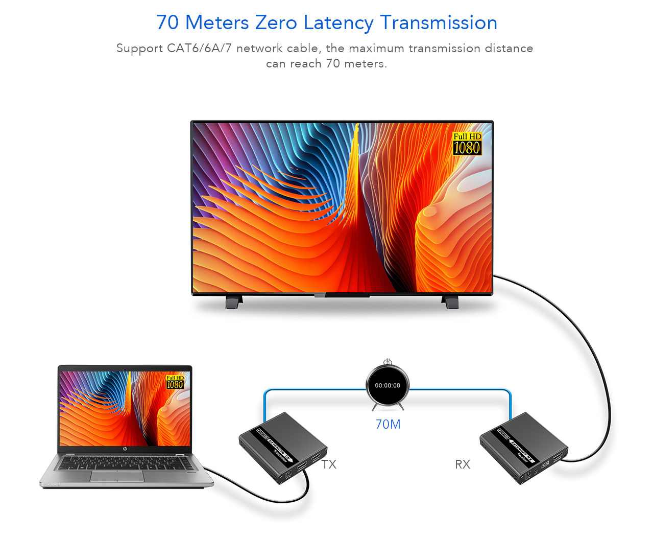 Díky použití síťového kabelu je možné dosáhnout až 70 metrů přenosové délky s rozlišením FULL HD 1080p videa.