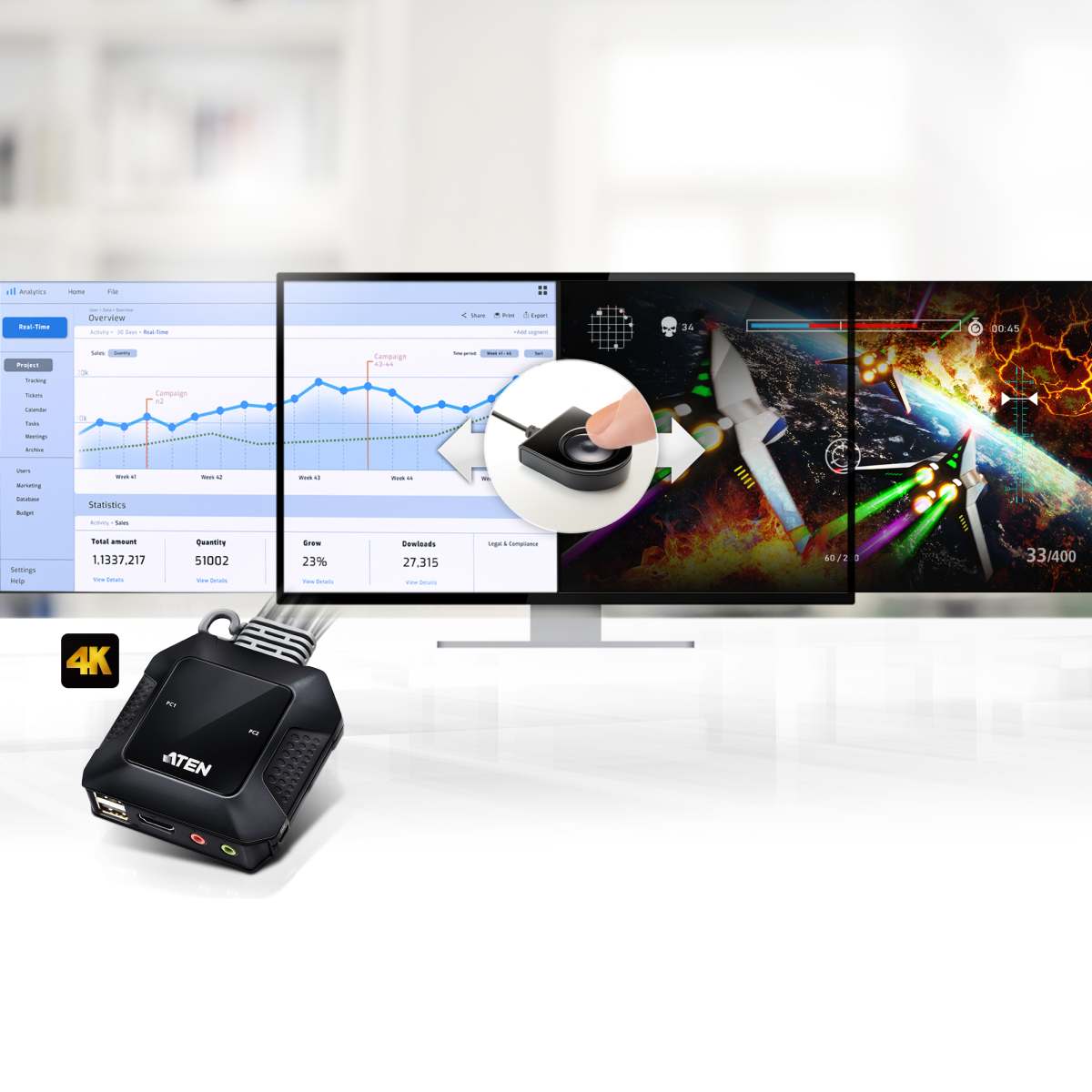 Kabelový přepínač KVM ATEN CS22H může okamžitě přistupovat ke dvěma počítačům pomocí konzoly USB a HDMI a zároveň nabízí vynikající kvalitu videa až do rozlišení 4K DCI (4096 x 2160 při 60 Hz), což uživatelům přináší maximální pohodlí a optimální obraz.