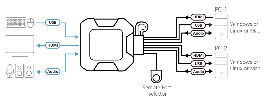 - Jedna klávesnice USB, myš a jeden monitor HDMI ovládají dva počítače HDMI