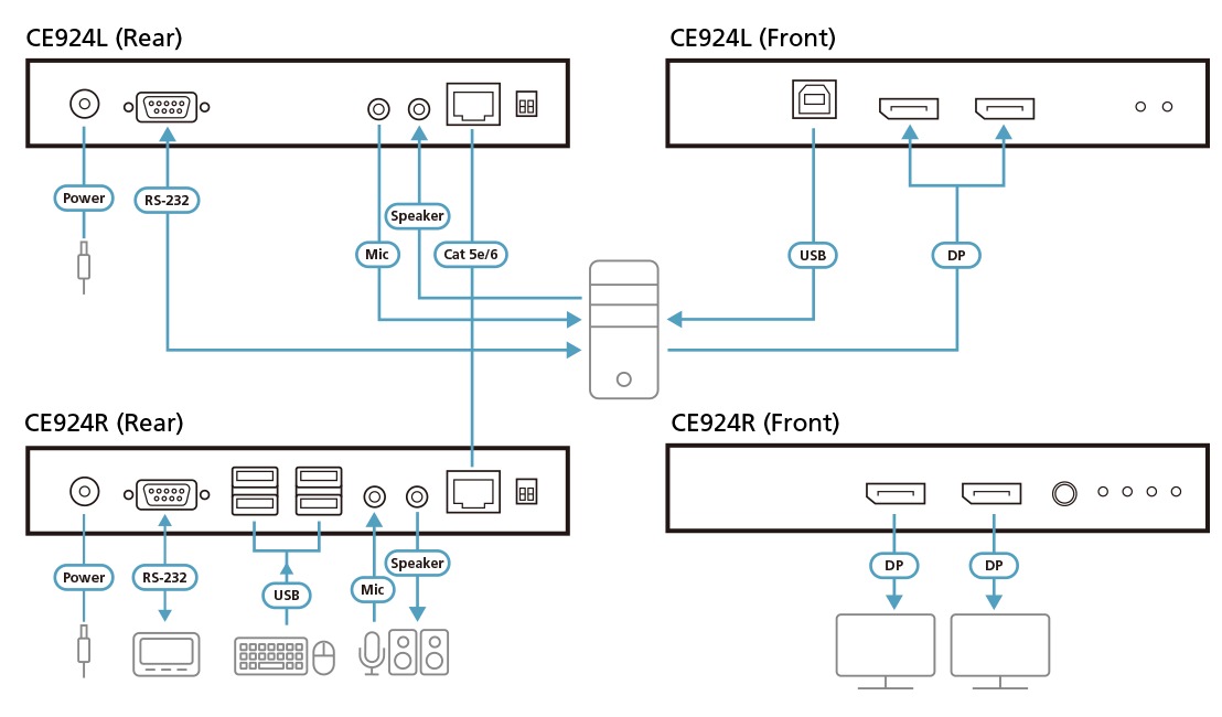 CE924 navíc podporuje jeden 4K displej nebo duální 1080p displej pro rozlišení výstupu videa DisplayPort až do 100 m pomocí jediného kabelu Cat6 / 2L-2910 Cat 6. Se snadnou instalací kabelu podporující různé signály je CE924 ideální pro aplikace, kde je vyžadován pohodlný vzdálený přístup - jako jsou kontrolní centra dopravy, zdravotnická zařízení, průmyslové