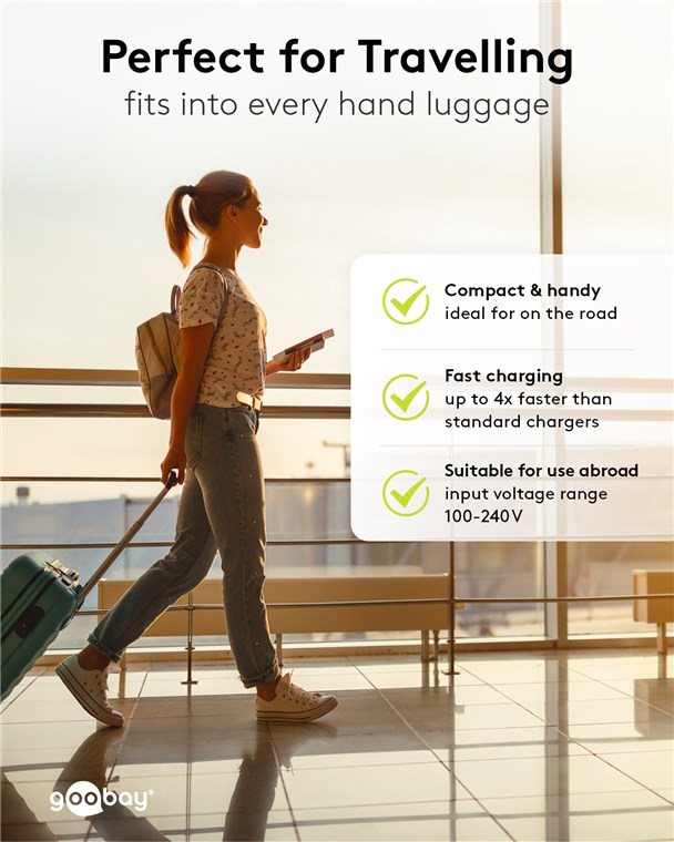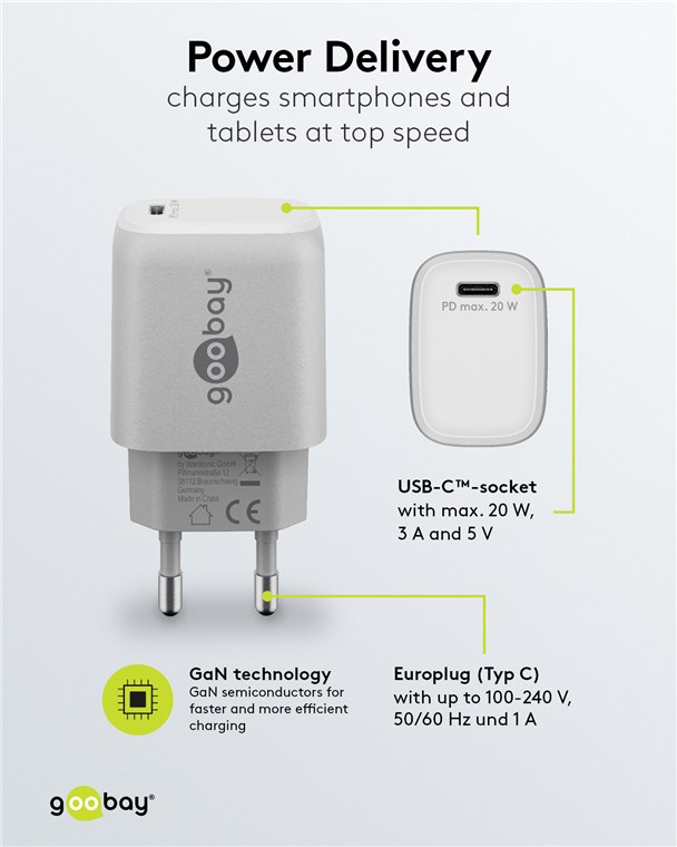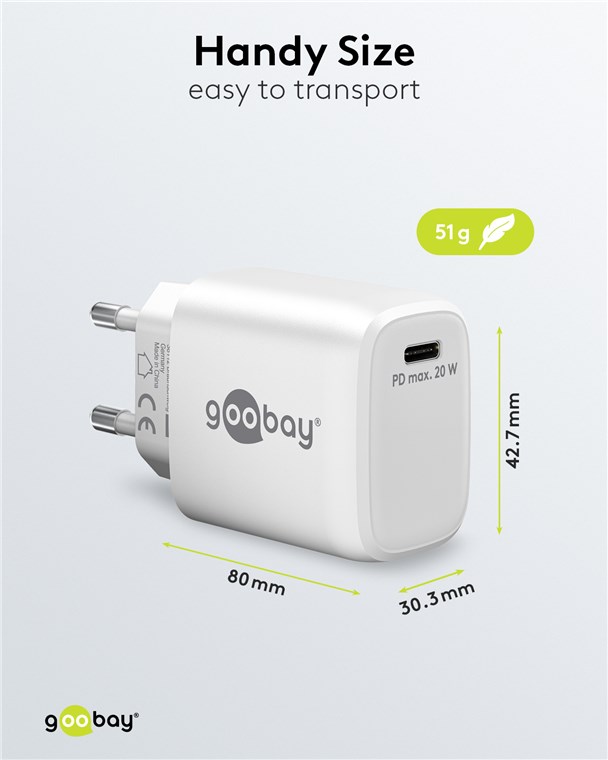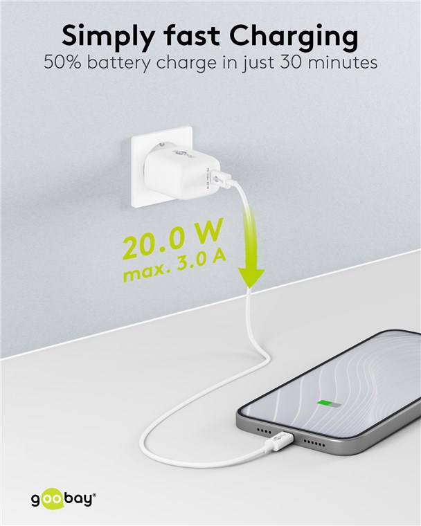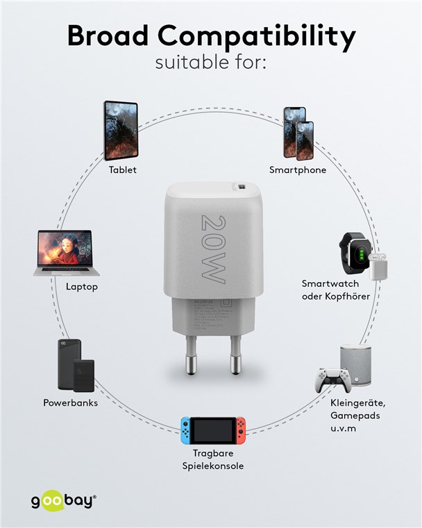 S výkonem 20 W je nabíjecí adaptér speciálně přizpůsoben pro malá zařízení, jako jsou smartphony, Bluetooth sluchátka, tablety nebo powerbanky.