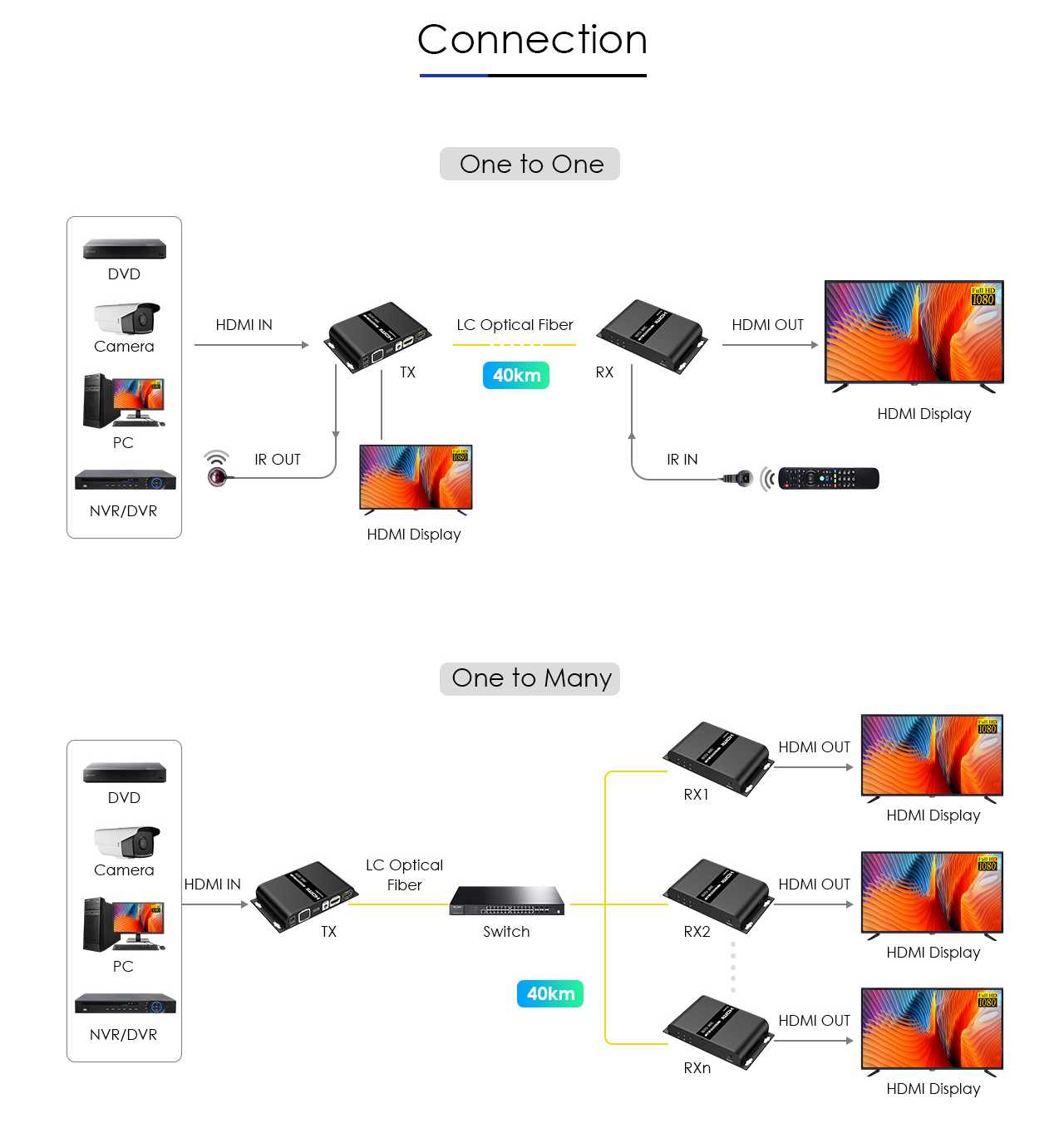- Výstupní signál z vysílače lze přes optický switch připojit až na 16 přijímačů a zobrazit na 16 monitorů