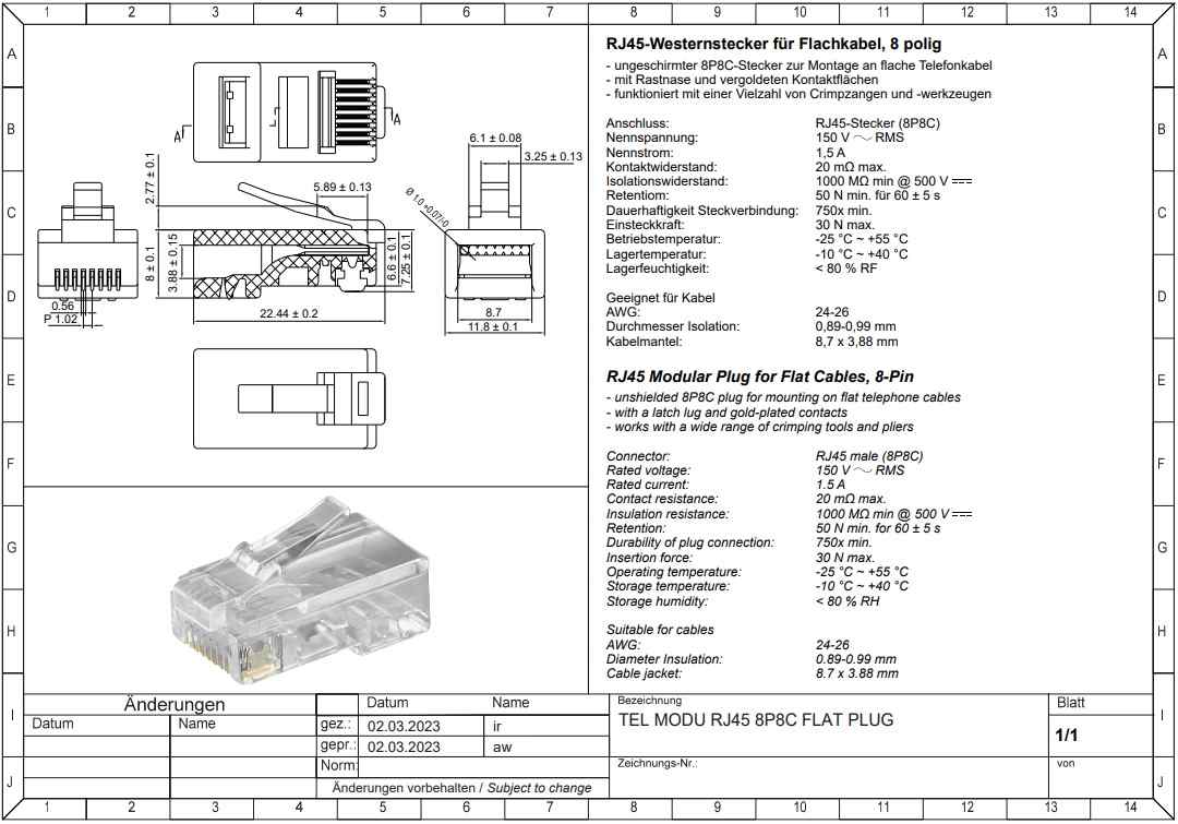 Konektor RJ45 8pinů Cat6A - montáž bez nástroje, průměr kabelu AWG 22/1 - 24/1