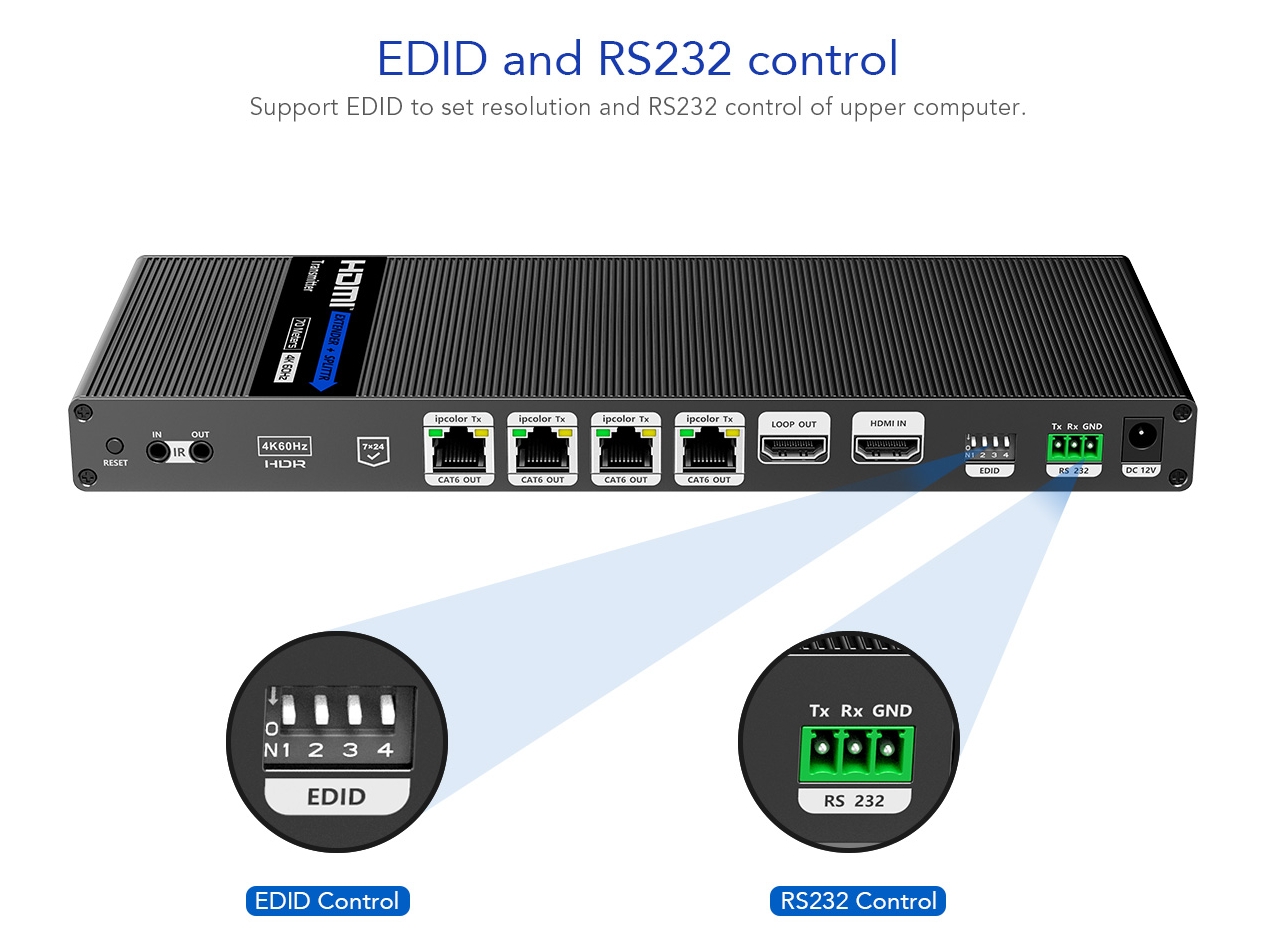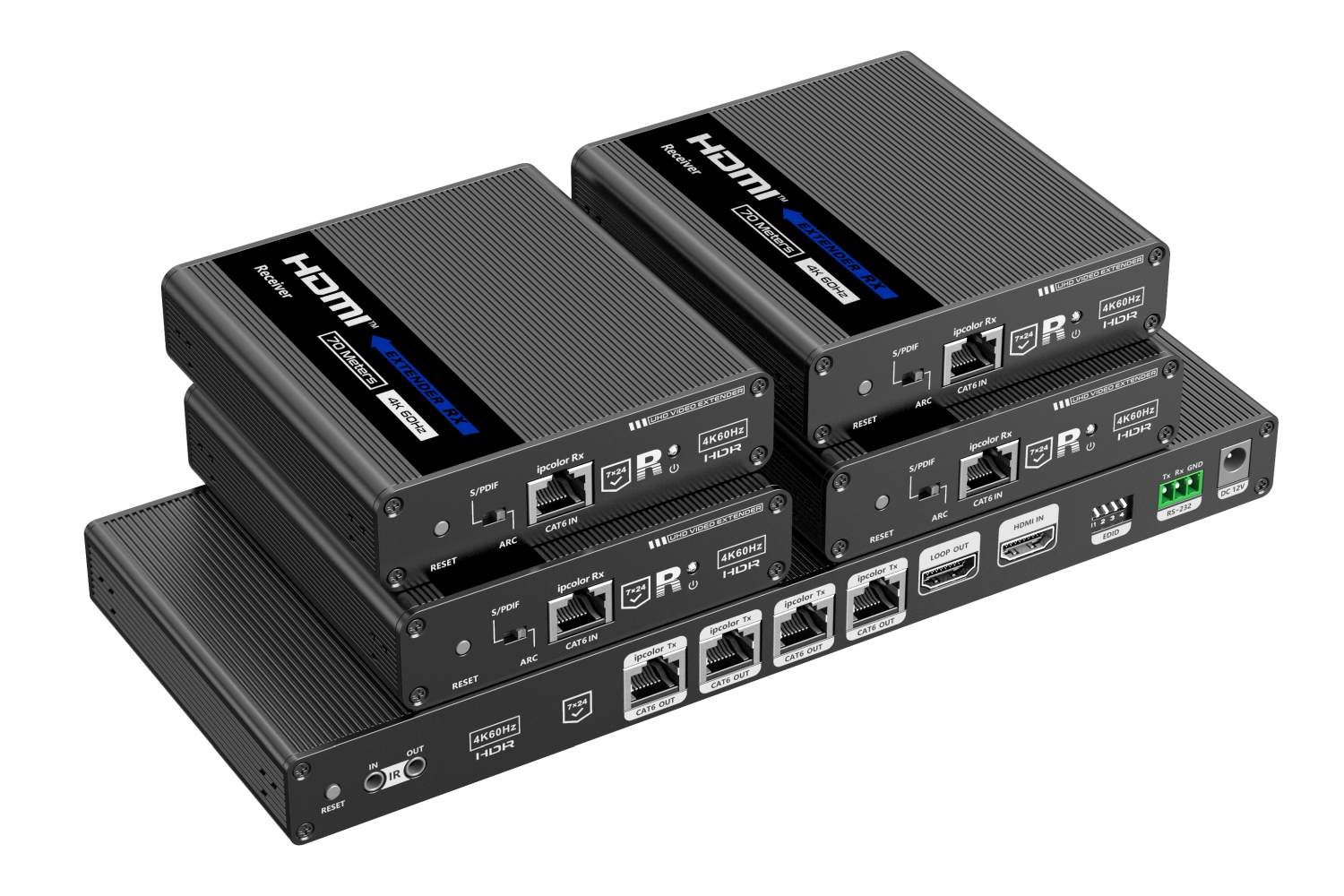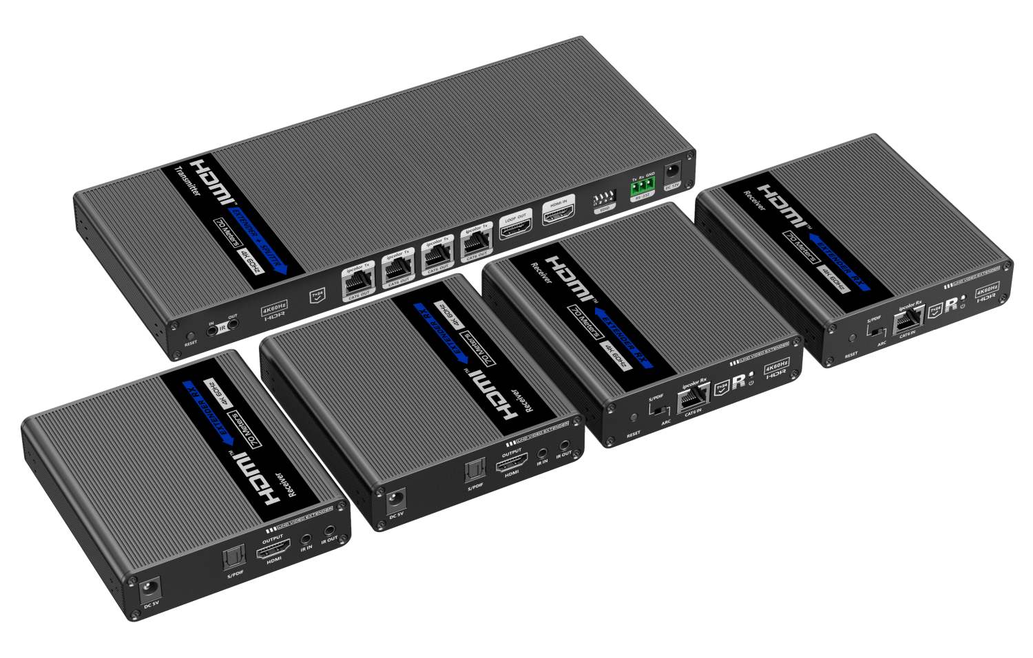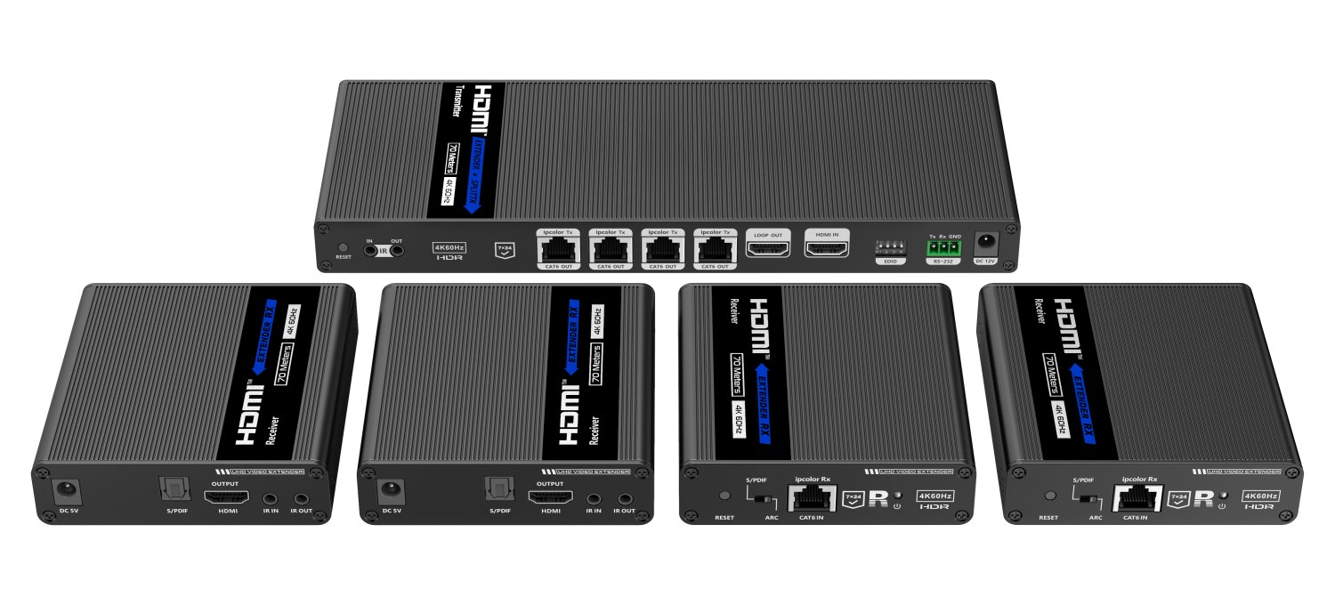 - Výstupy: 1x lokální výstup HDMI a vysílači, 4 x HDMI výstupy (Type A) na přijímačích