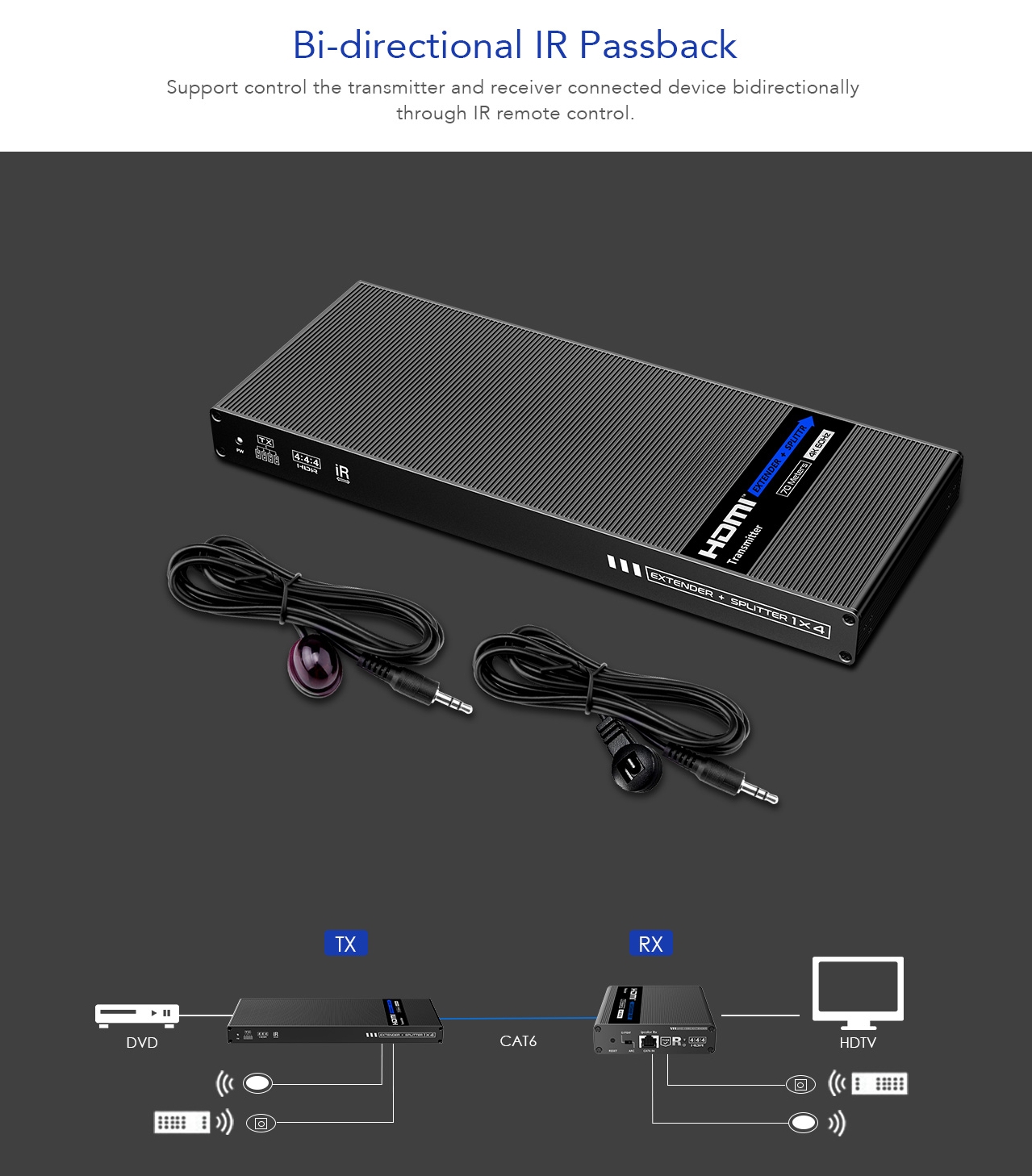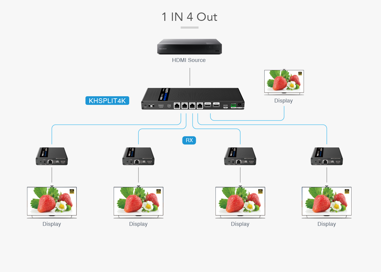 Extender se skládá z jedné vysílací jednotky s lokálním výstupem HDMI a čtyř přijímačů, které se propojí CAT6/6a/7 kabelem s vysílačem.