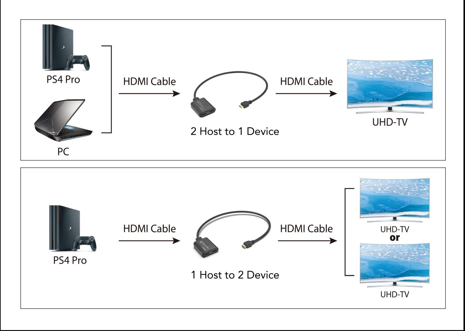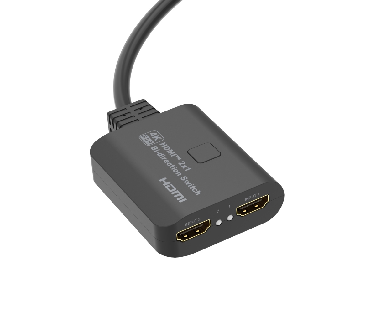 2 HDMI zařízení sdílejí 1 HDMI obrazovku nebo přepínač z jednoho zdroje HDMI signálu přepíná na dva monitory (vždy se zobrazuje obraz pouze na jednom z monitorů). Výběr zařízení je tlačítkem na přepínači.
