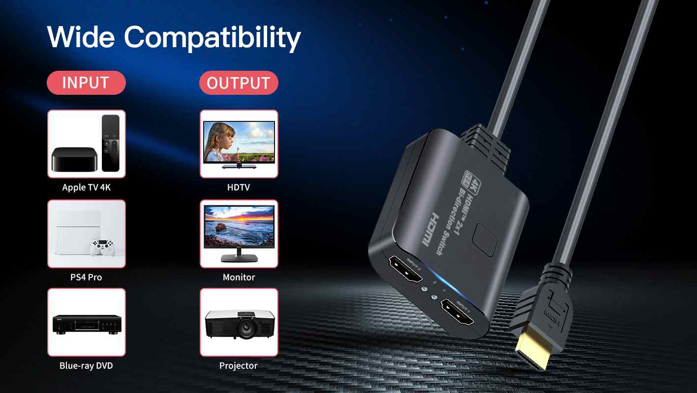 - Tento obousměrný přepínač HDMI byl speciálně navržen pro 4K@60Hz SDR RGB 4: 4: 4
