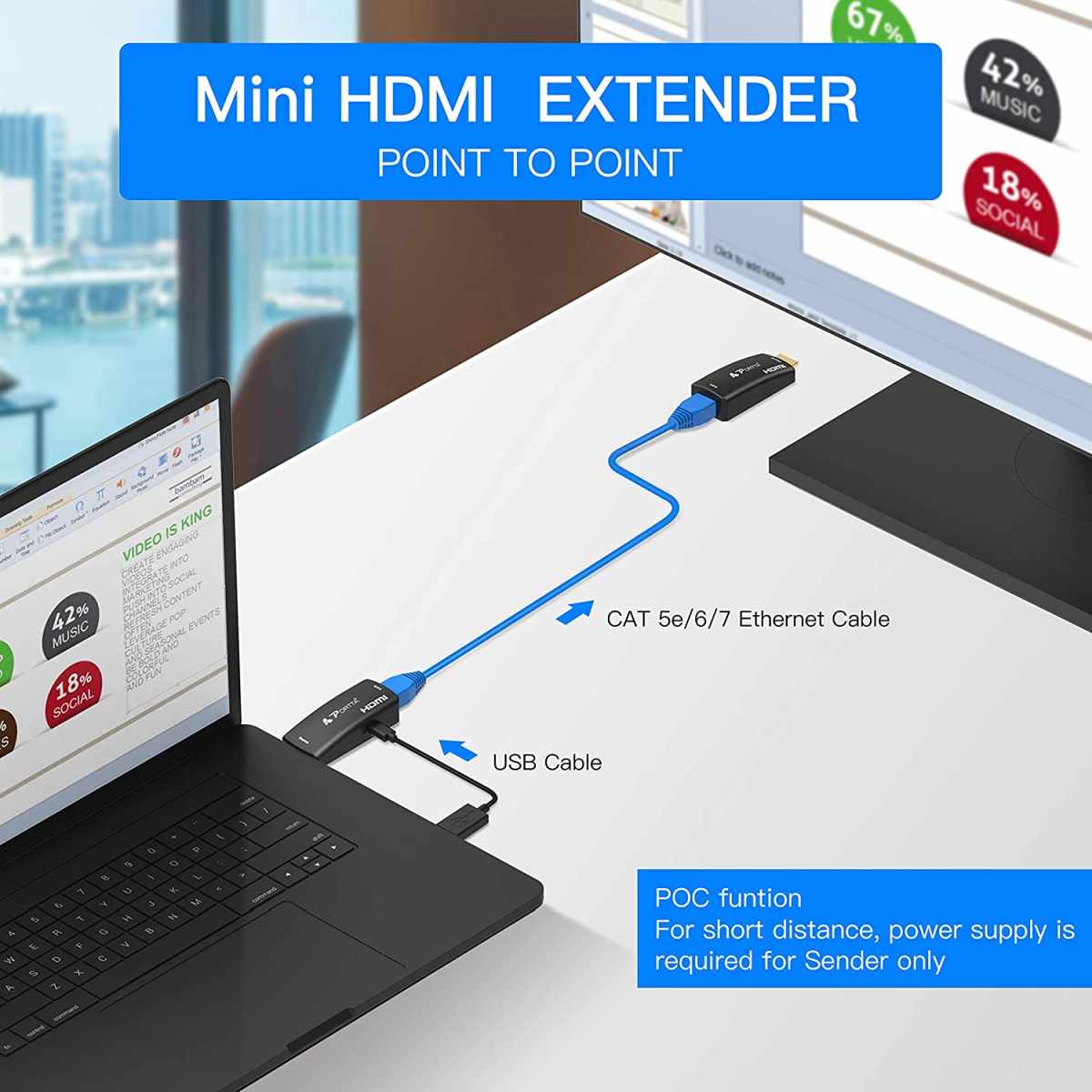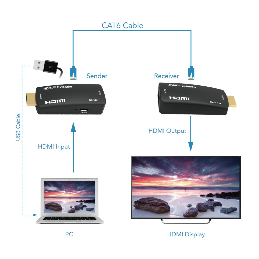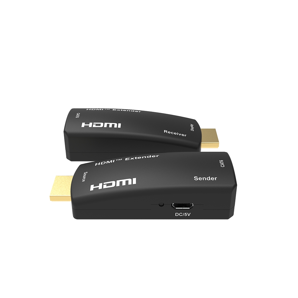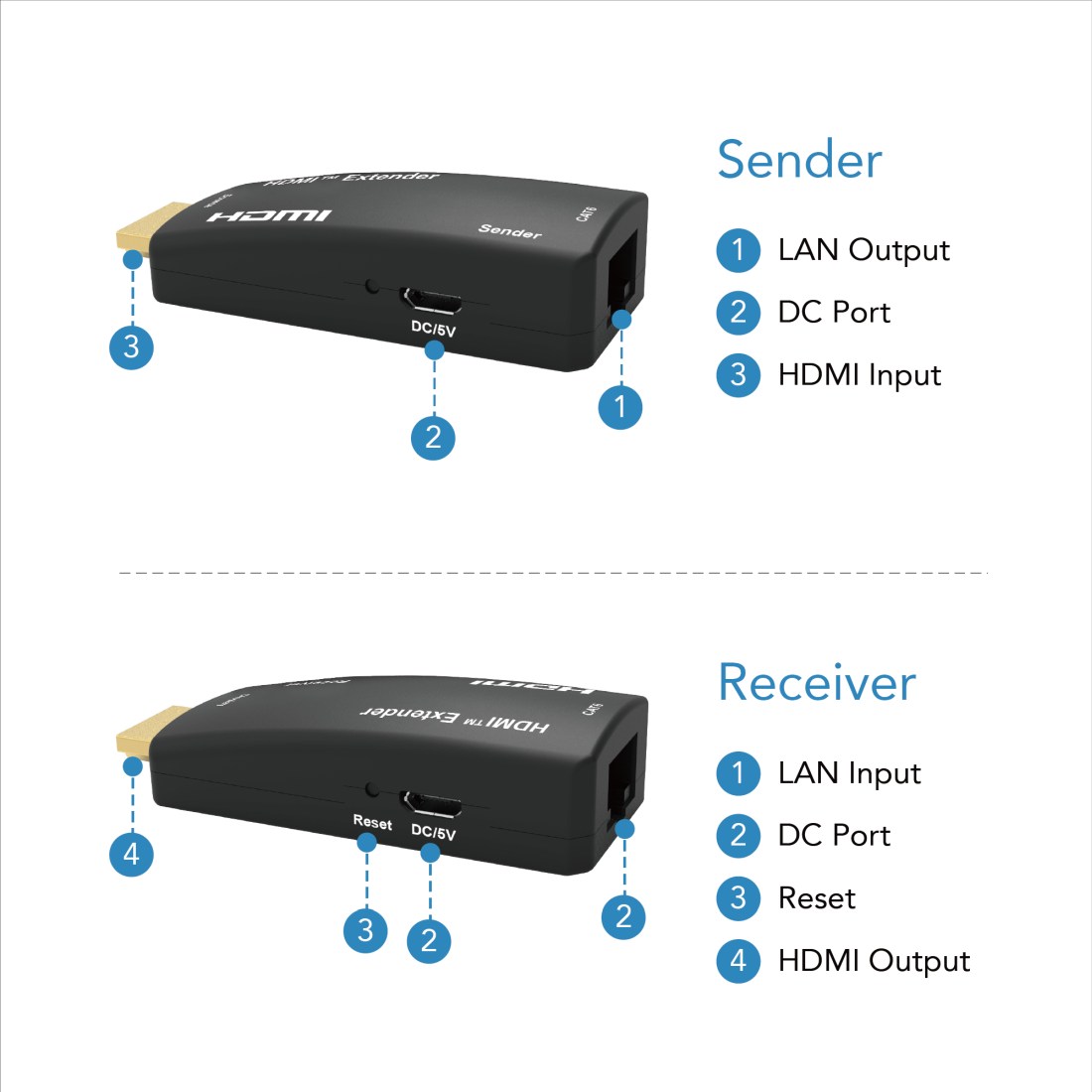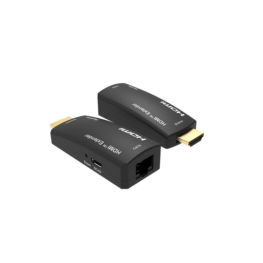 - Extender obsahuje vysílač a přijímač, kteří se propojí jedním kabelem Cat5e,Cat6,Cat6A,Cat7