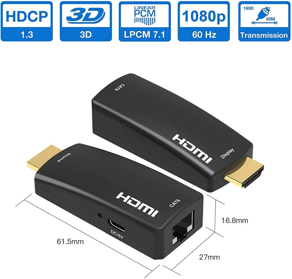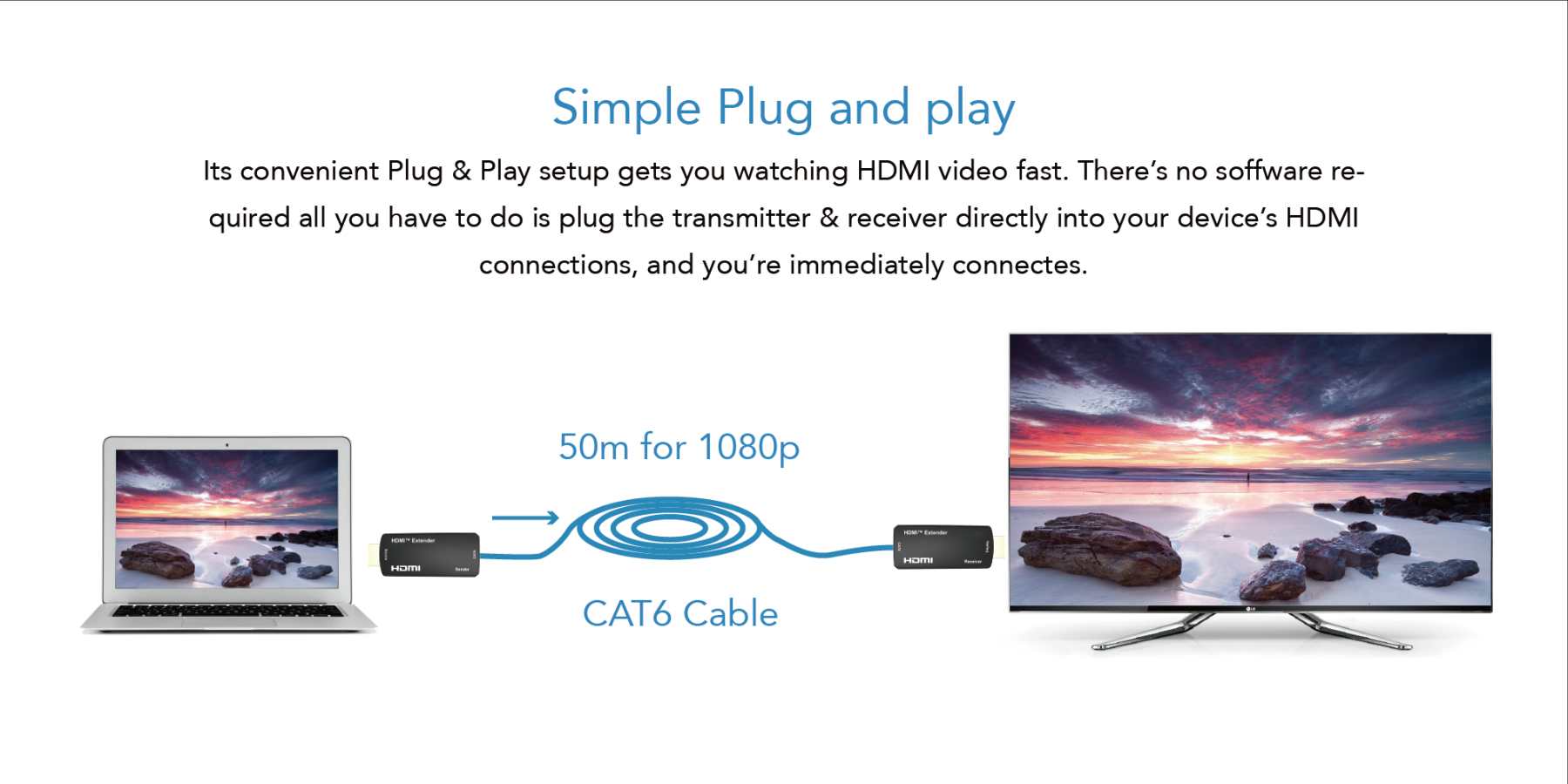 - Podporuje FULL HD 1080p až na 50m s kabelem Cat6 a vyšším (40m s Cat5e) doporučujeme použít kvalitní LAN kabel s měděnými vodiči a AWG23. Kvalita LAN kabelu omezuje délku přenosu.