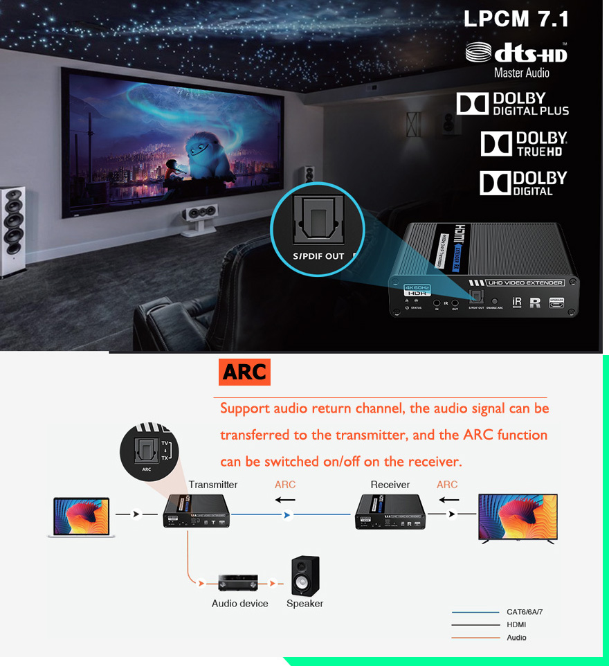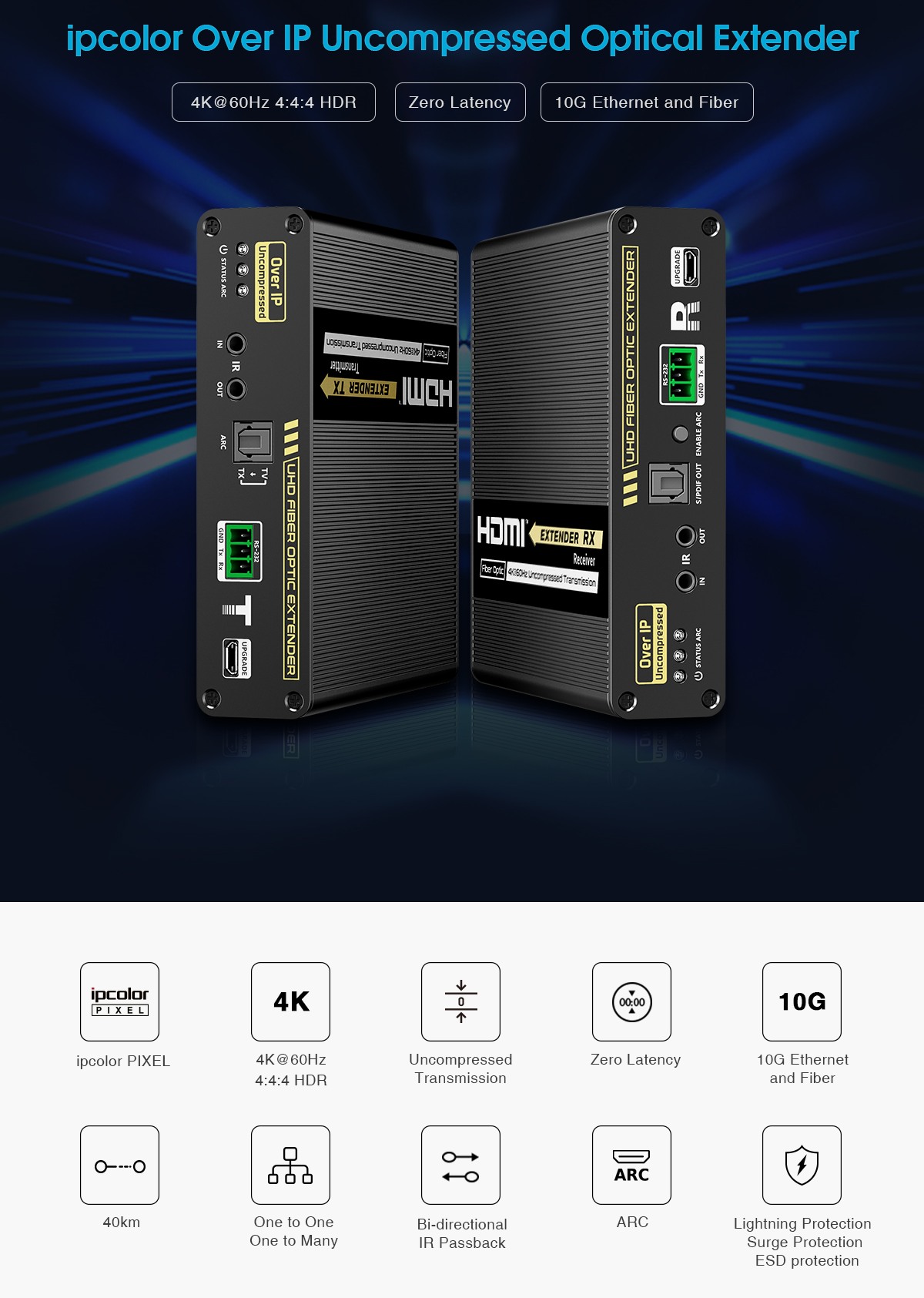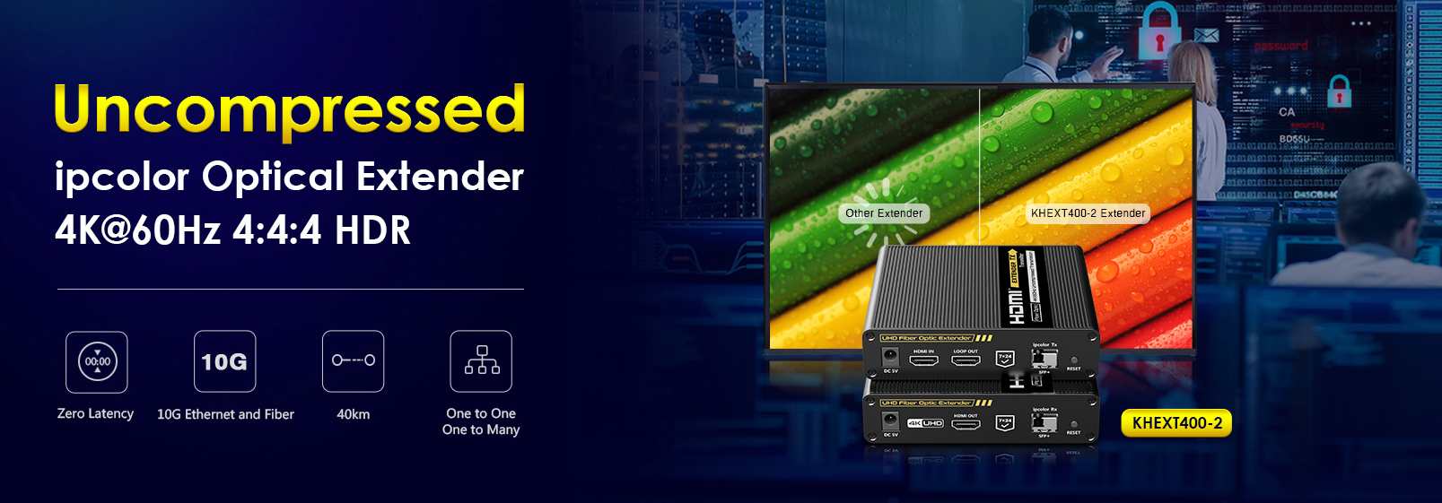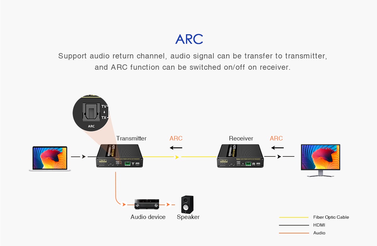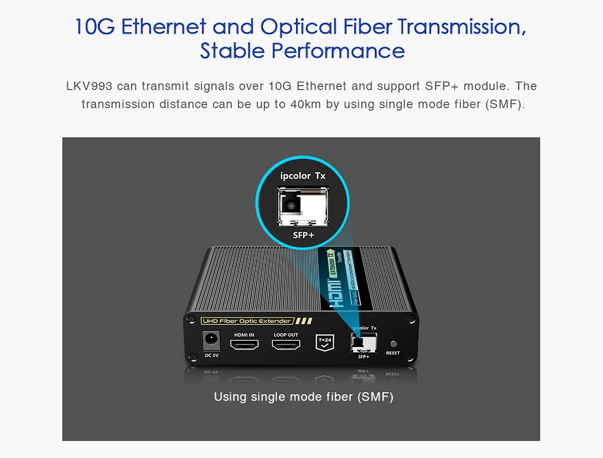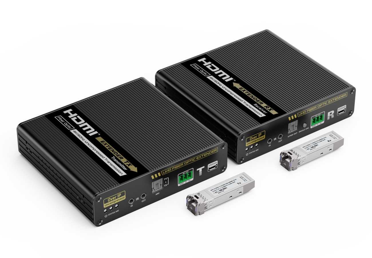 Přenášejte obrazové a zvukové signály HDMI na vzdálenost až 40 km pomocí optických kabelů. Kromě toho můžete přenášet signály dálkového ovládání IR do zdrojového zařízení. Zdrojové zařízení tak můžete ovládat z přijímače. Pomocí tohoto vysoce výkonného video systému můžete napájet mnoho přijímačů na velikou vzdálenost pomocí optického přepínače. Tato sada se skládá z modulu vysílače a přijímače a je zvláště vhodná pro přenos signálů HDMI na velké vzdálenosti. Ideální pro spojení mezi budovami nebo velkými průmyslovými komplexy.