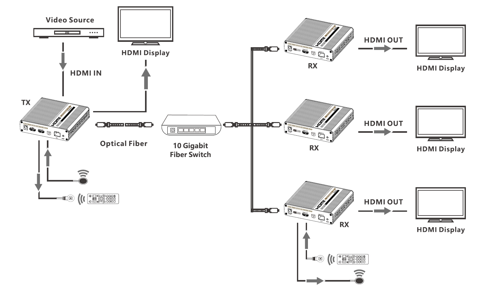 - Extender umožňuje propojení jeden na jeden nebo za pomoci optického switche zapojení jeden na mnoho přijímačů nebo do kaskády.