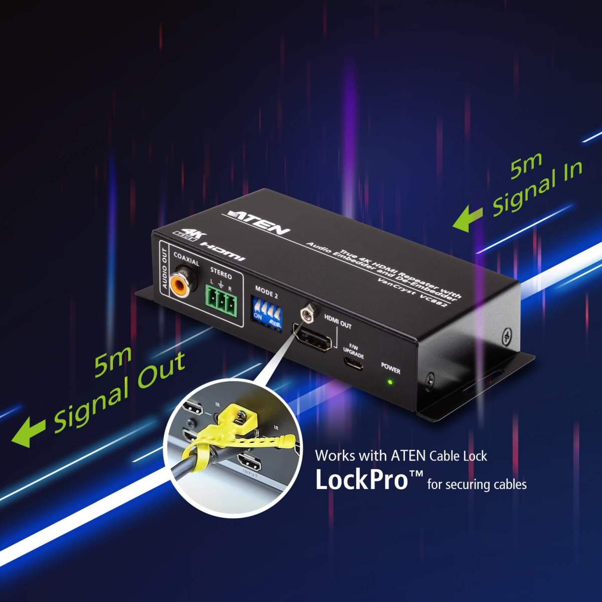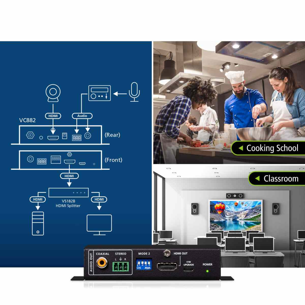 Pro ochranu obsahu vyhovuje standardu HDCP 2.2. Díky kompaktnímu designu skříně, přenosu signálu True 4K a schopnosti vkládání /oddělování audia je VC882 ideální pro školicí a konferenční místnosti,