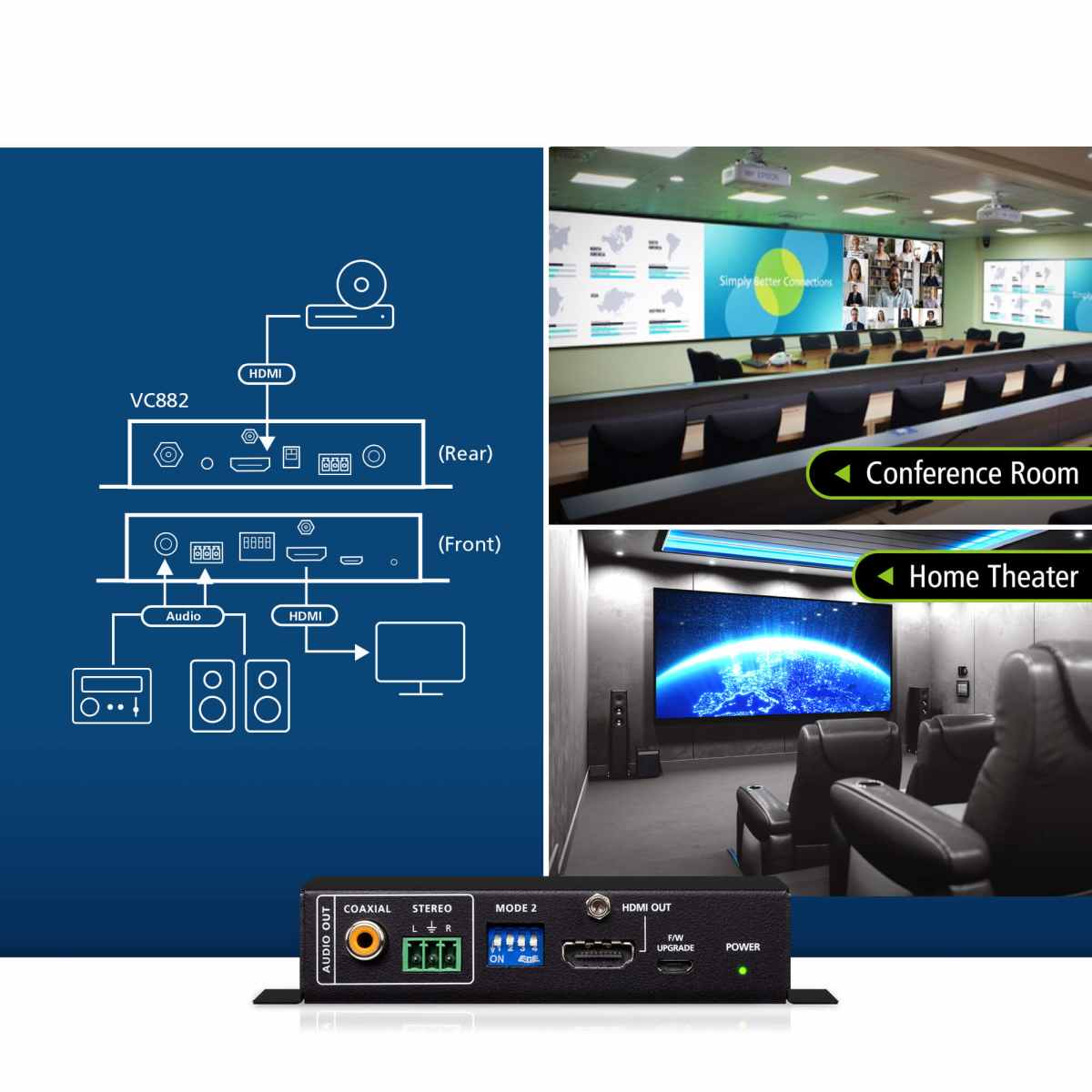 metrů s rozlišením True 4K. Kromě vložení samostatného zvuku do odchozího signálu HDMI umožňuje VC882 také extrakci zvuku ze signálu HDMI a výstup extrahovaného signálu prostřednictvím