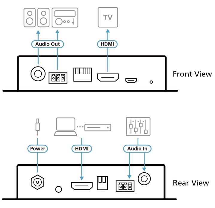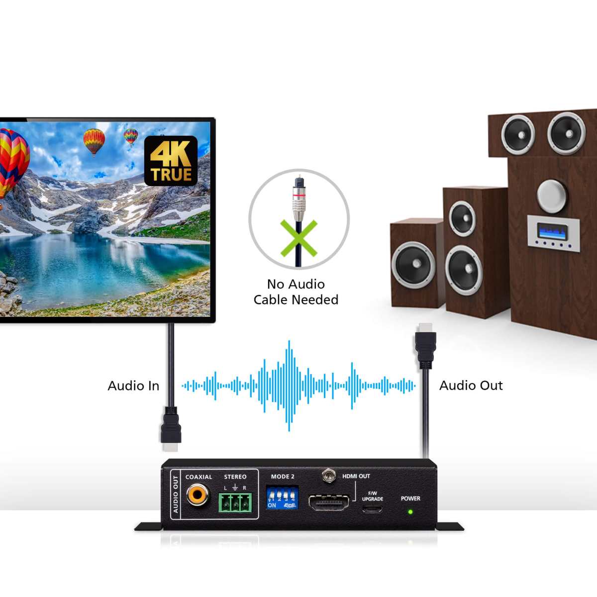 - Vloží zvuk na výstup HDMI nebo odebere zvuk ze signálu HDMI a na výstup extrahuje signál prostřednictvím alternativního zvukového systému