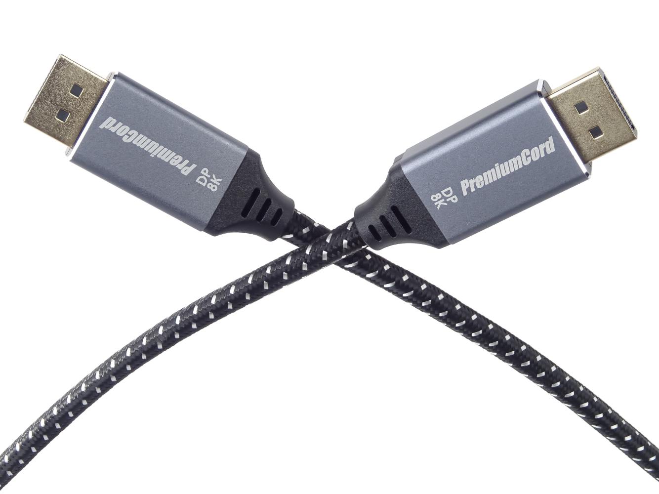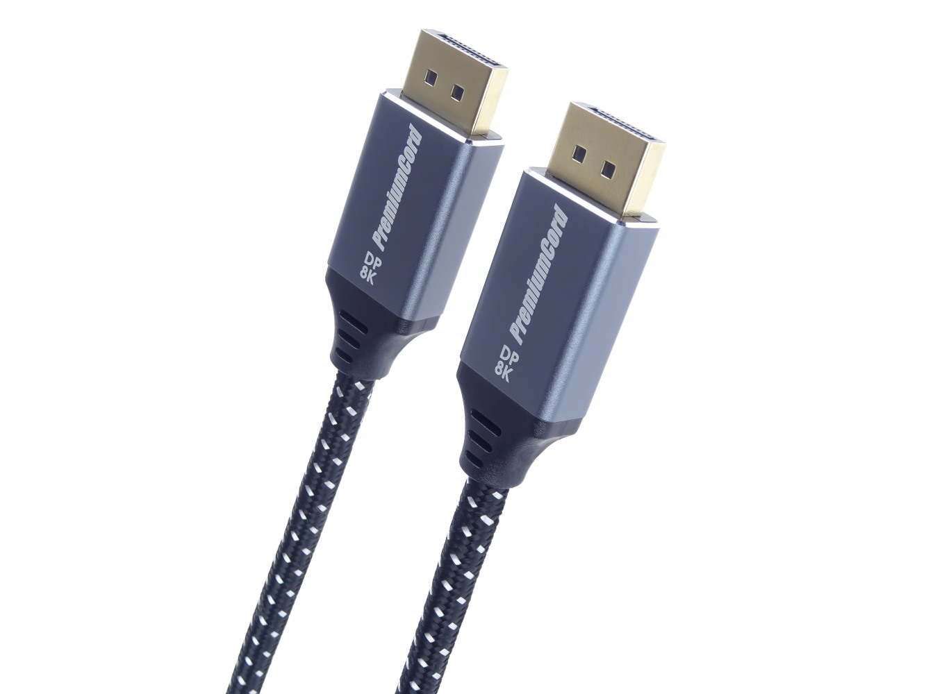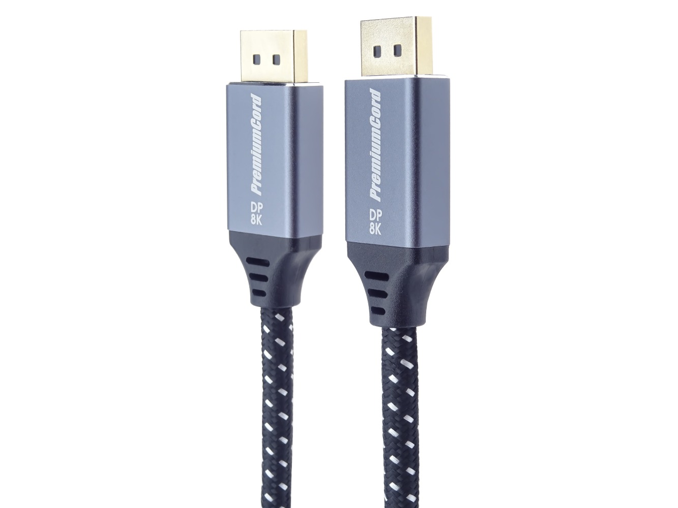 PremiumCord DisplayPort 2.0 přípojný kabel M/M, zlacené konektory, DisplayPort 2.0 zvyšuje maximální datovou rychlost 2,5krát oproti rychlostem datového přenosu DisplayPort 1.4 datový přenos až 80 Gb/s, rozlišení 16K, 10K, 8K a 4K