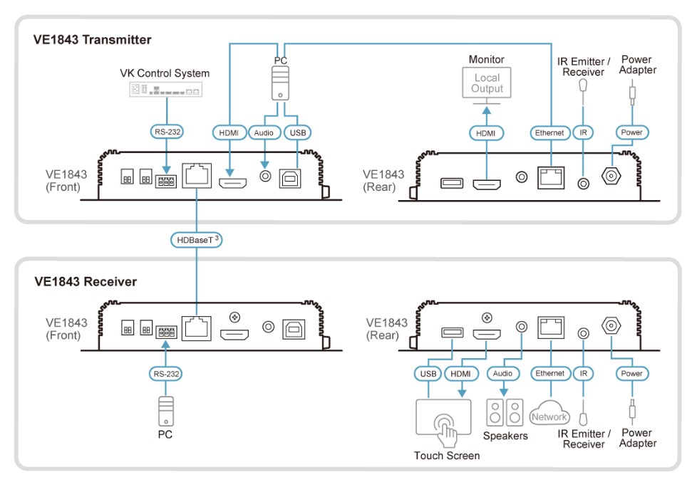 VE1843, navržený s technologií HDBaseT 3.0, nejenže prodlužuje nekomprimované signály True 4K až na 100 m na jeden kabel Cat 6a s nulovou latencí, ale také přenáší signály IR, RS-232, Ethernet, nezávislé audio a USB s nejnovější HDBaseT standardy. Pro stabilní přenos signálu HDMI, VE1843