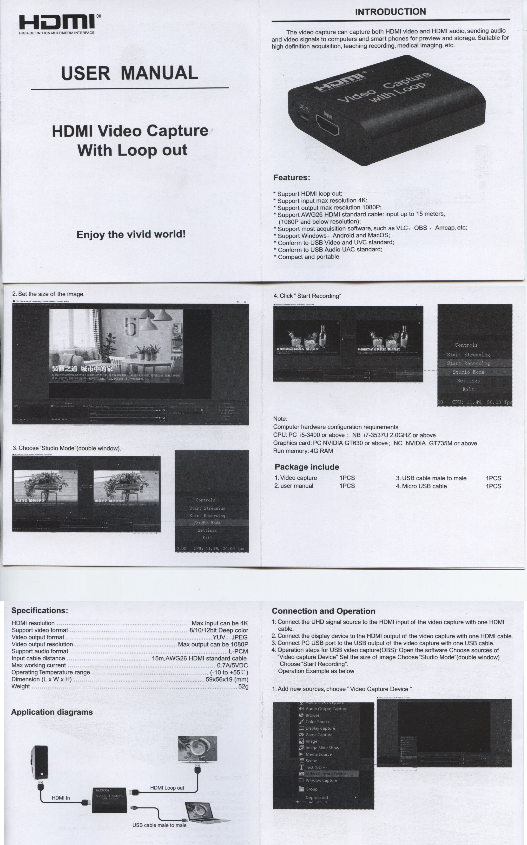 - Vysoké rozlišení nahrávání 1080P, podporuje maximální vstupní rozlišení 3840 × 2160 při 30 Hz, maximální výstupní rozlišení 1920 × 1080 při 60 Hz.
