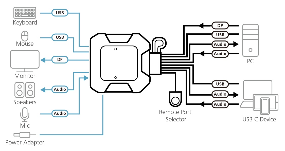 - Jedna konzola KVM ovládá jeden počítač USB DisplayPort a jedno zařízení s USB-C portem