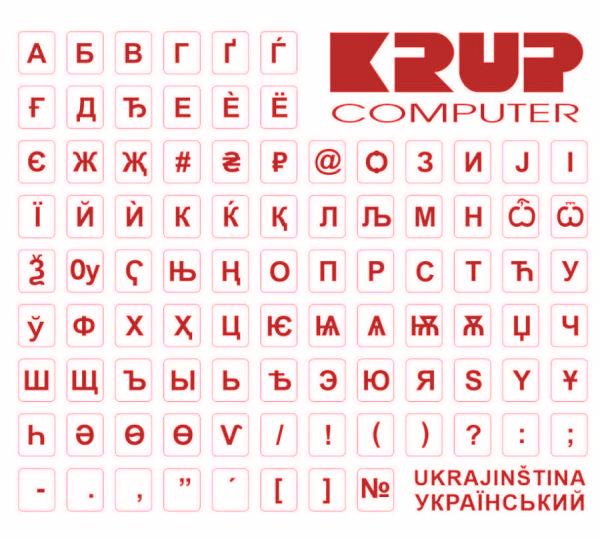 - Červená barva písma a průhledné pozadí přelepů - Přelepka vhodná na nalepení na světlou klávesnici s černým písmem - Azbuka s kompletní sadou znaků používanou na Ukrajině - Jednotlivé přelepky velikost 6 x 7 mm - Kompletní aršík má velikost 10 x 9 cm - Přelepky je možné lepit i na kraj kláves - Kompletní přetisky, vhodné i pro notebooky