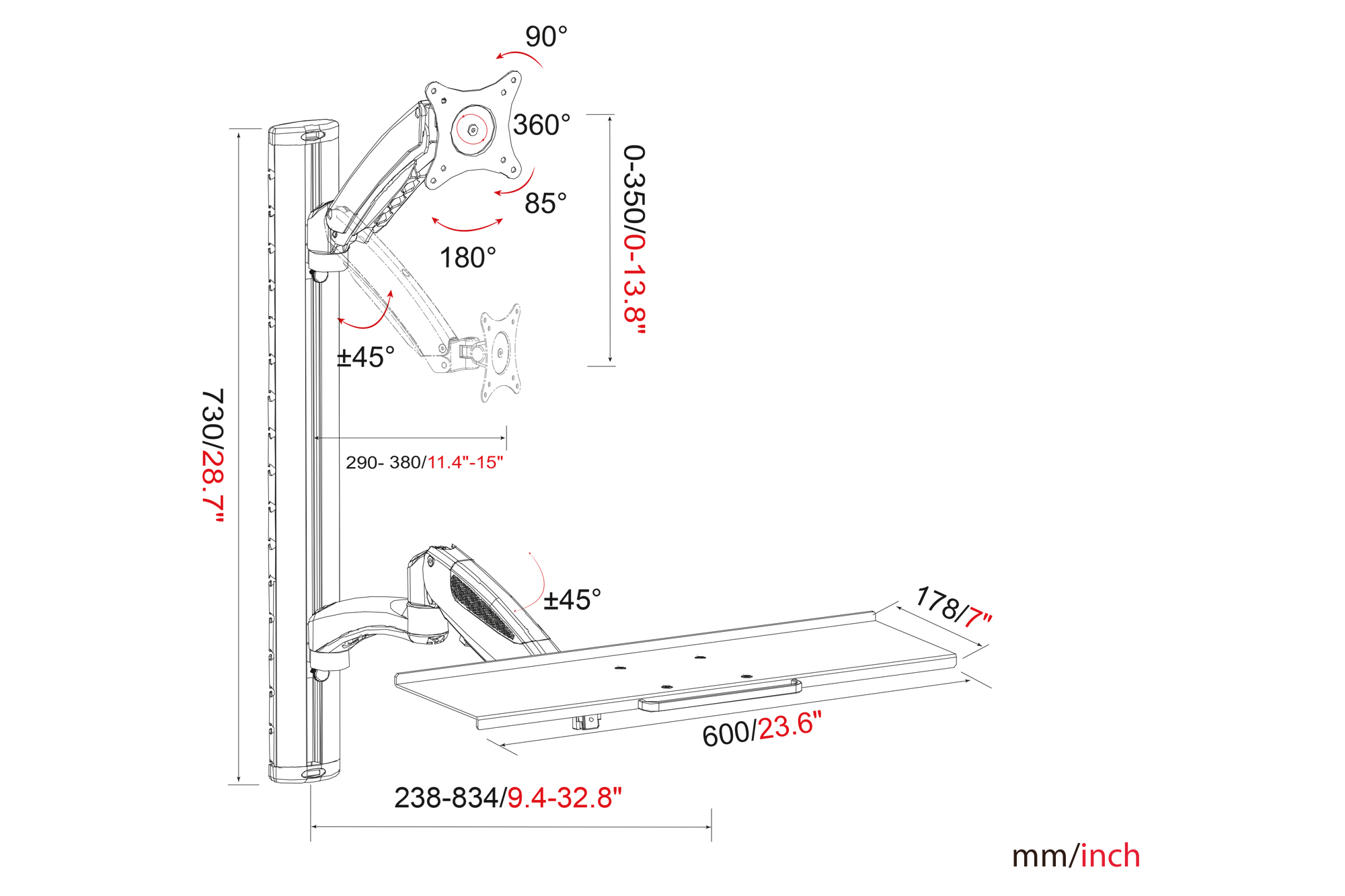 Univerzální držák s flexibilním nastavením výšky pro montáž monitorů a klávesnic na stěnu