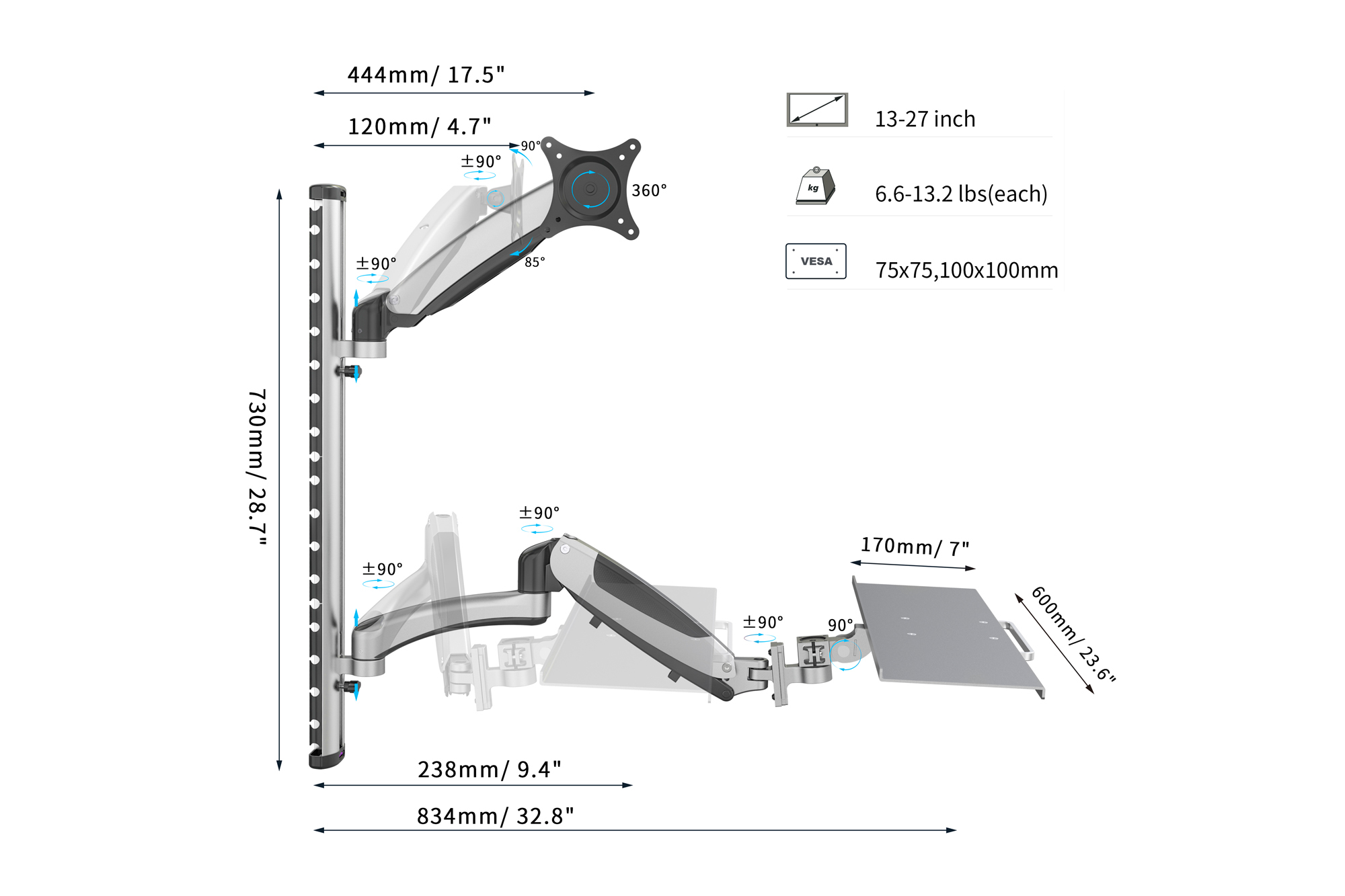 Držák na monitor a klávesnici pro LCD/LED max. nosnost 6kg, VESA 100x100