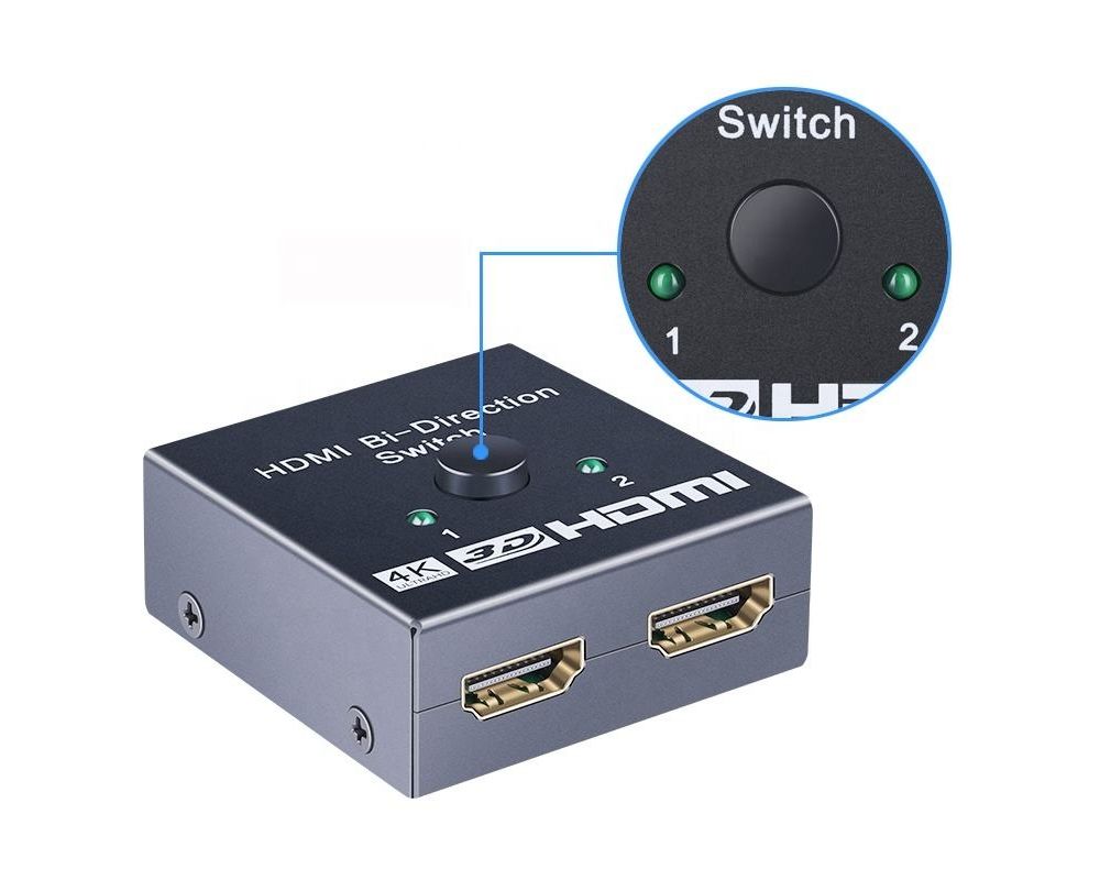 2 HDMI zařízení sdílejí 1 HDMI obrazovku nebo přepínač z jednoho zdroje HDMI signálu přepíná na dva monitory (vždy se zobrazuje obraz pouze na jednom z monitorů). Výběr zařízení je tlačítkem na přepínači.