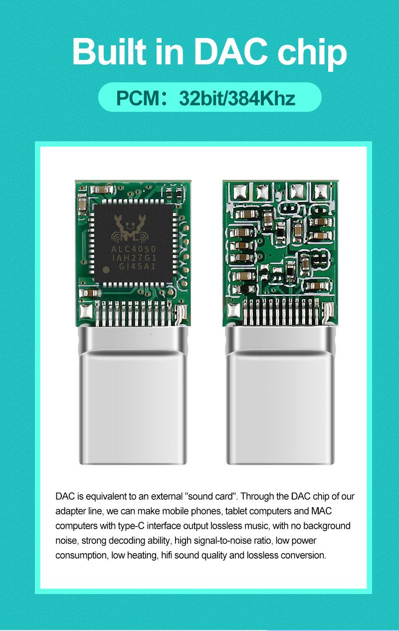 - Adaptér má navíc integrovaný digitálně analogový převodník (DAC chip), takže se hodí pro všechny mobily s USB-C, i pro mobily, které DAC zabudovaný nemají.