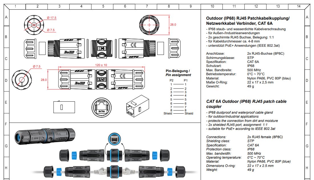 Tato spojka kabelů je určena pro spojení dvou patch kabelů až Cat6A (nebo Cat5/6) a odstraňuje potřebu objemných spojovacích krabic. Je to neuvěřitelně snadné řešení - nepotřebuje žádné speciální nástroje, vyžaduje minimální prostor kolem sebe. Plně vodotěsné pouzdro (IP68) zajistí vodotěsnost ve venkovním prostředí