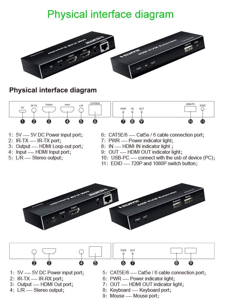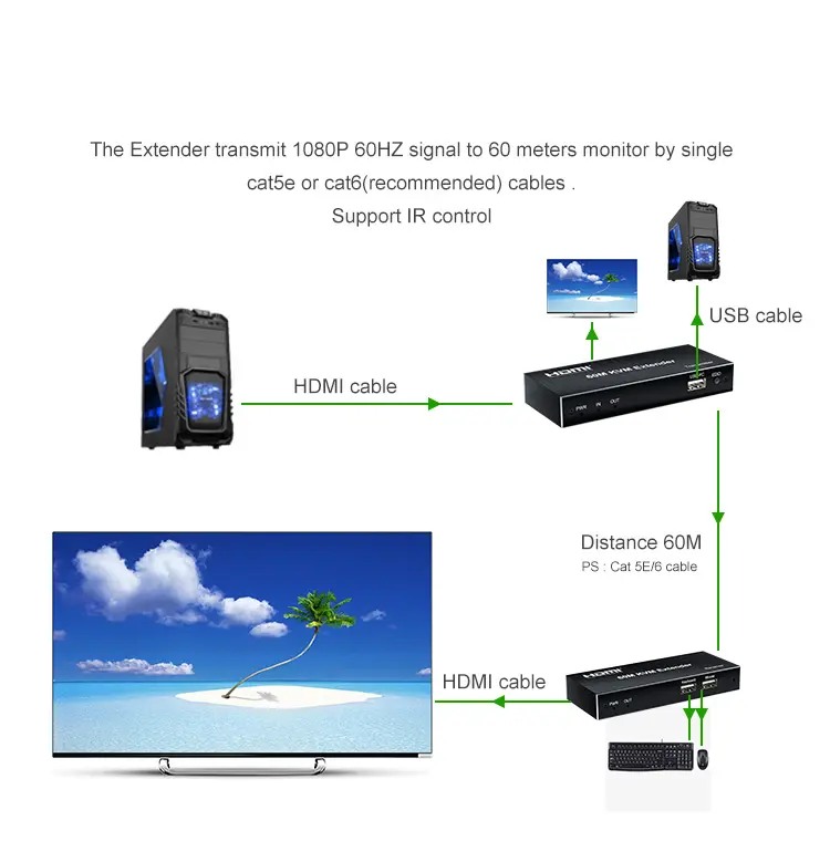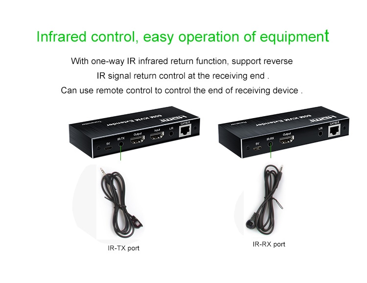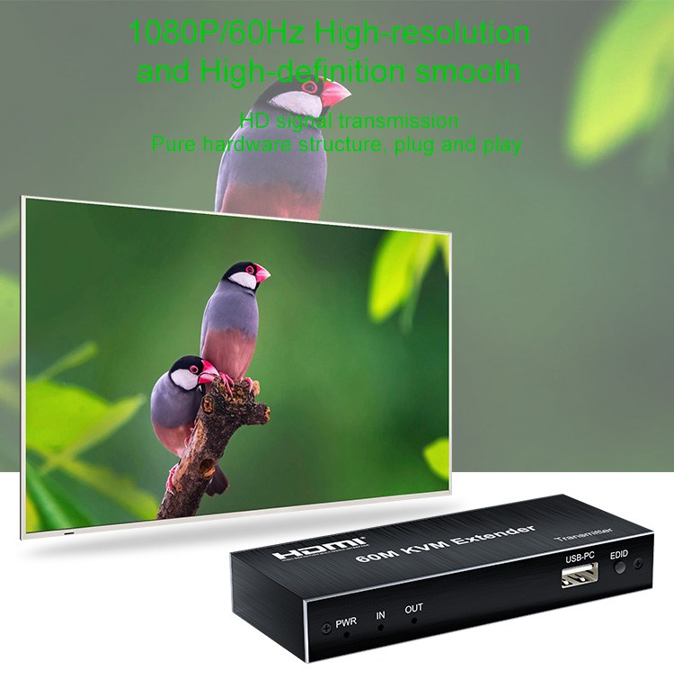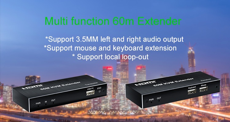 Zařízení umožňuje po jednom síťovém kabelu bez zpoždění přenést HDMI FULL HD 1080p signál, USB klávesnici a myš, IrDa dálkové ovládání až na vzdálenost 60m.Extender je vybaven audio výstupy.