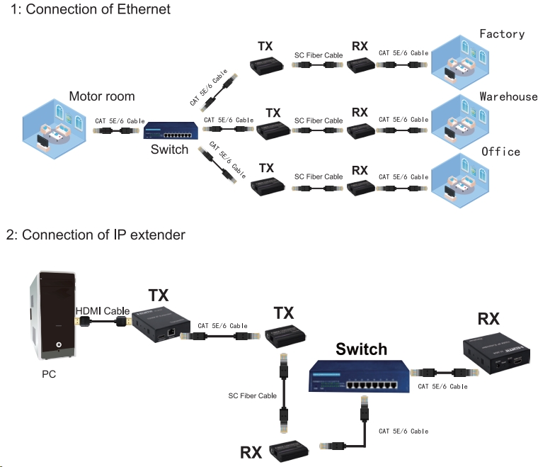 - Do vysílače se zapojí sítový kabel a na výstupu z přijímače se zapojí připojená síťová zařízení, switche nebo počítače.