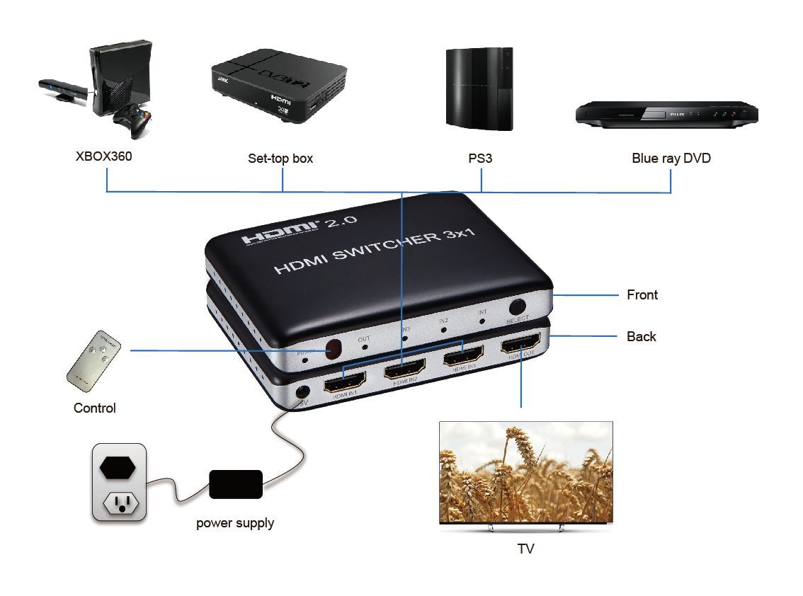 3 vstupní HDMI zařízení sdílejí 1 výstupní monitor, projektor. Výběr vstupních zařízení: 1.stisknutím tlačítka na čele přepínače, 2.dálkovým ovladačem