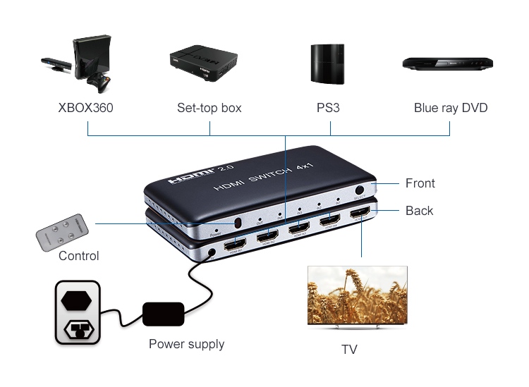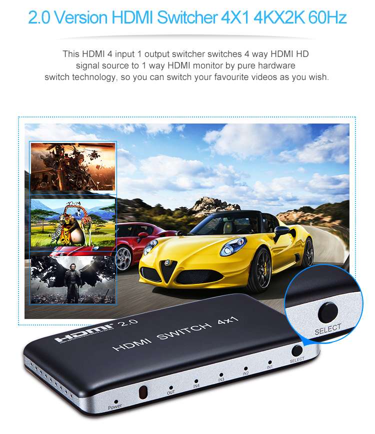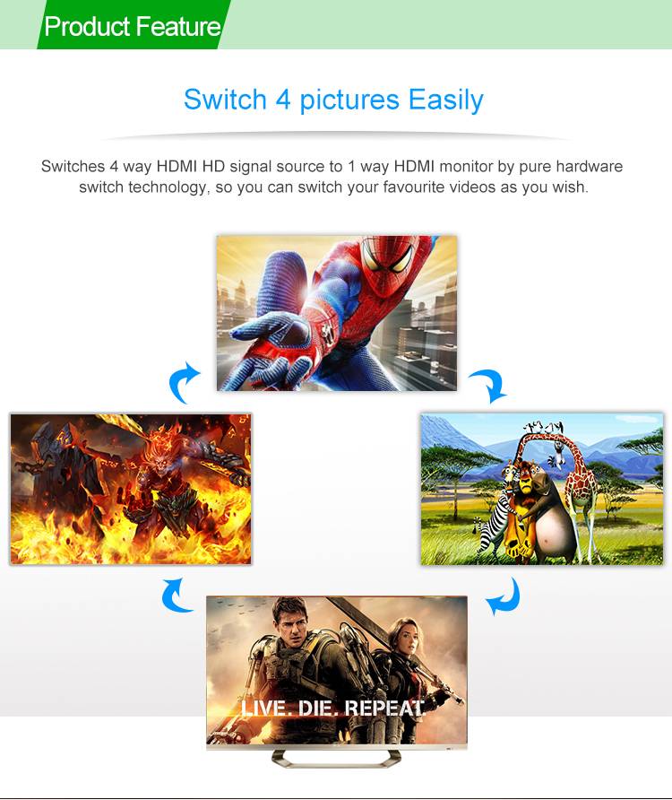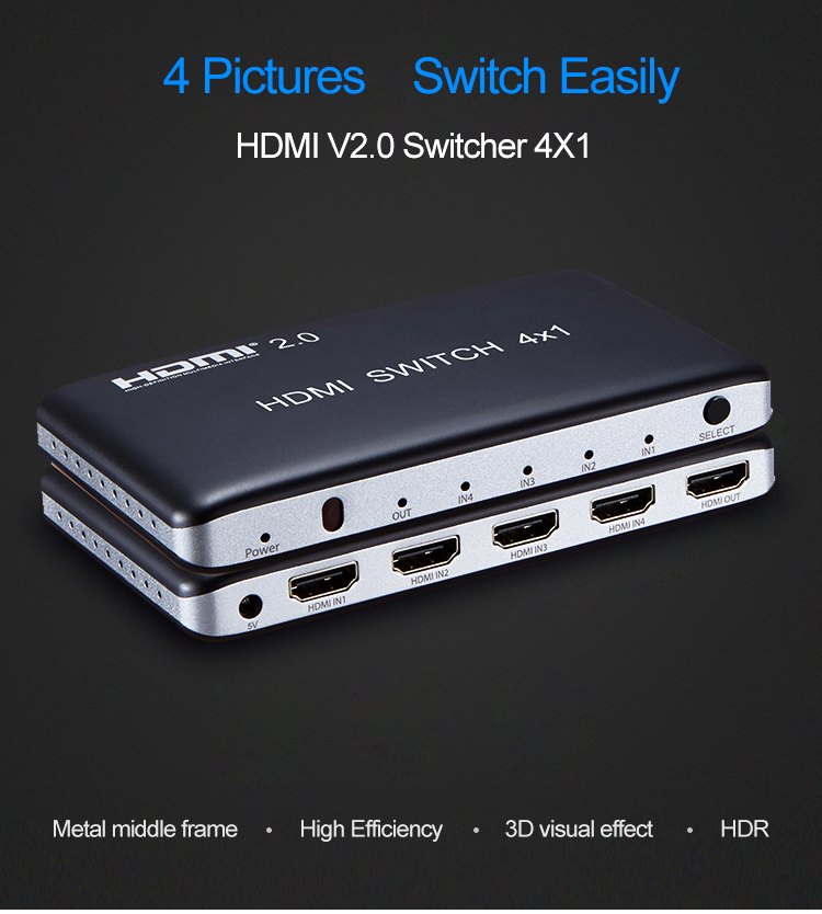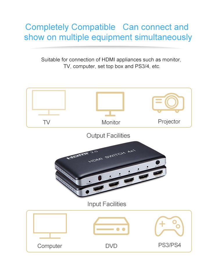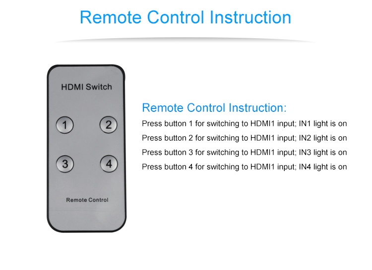 3 vstupní HDMI zařízení sdílejí 1 výstupní monitor, projektor. Výběr vstupních zařízení: 1.stisknutím tlačítka na čele přepínače, 2.dálkovým ovladačem