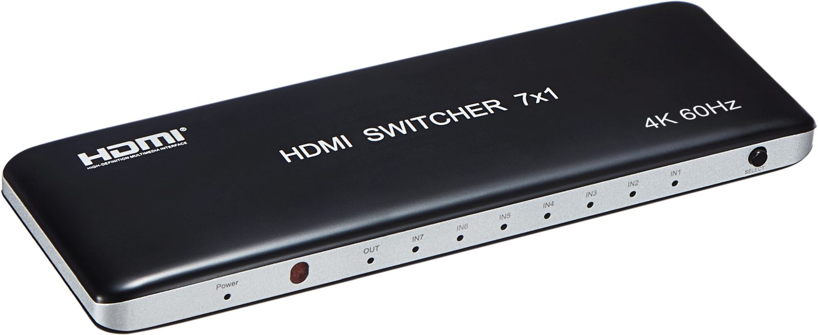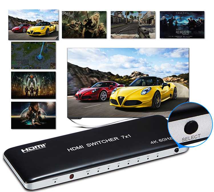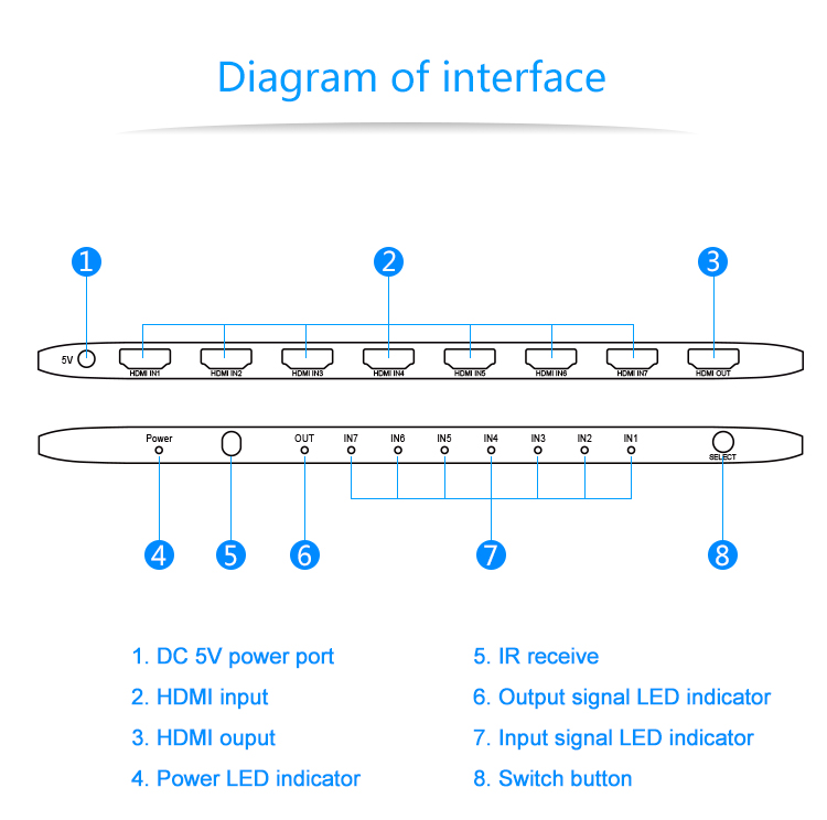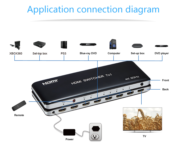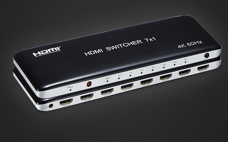 7 vstupních HDMI zařízení sdílejí 1 výstupní monitor, projektor. Výběr vstupních zařízení: 1.stisknutím tlačítka na čele přepínače, 2.dálkovým ovladačem