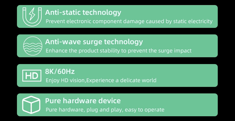 - Podporuje i nižší rozlišení HD obrazu:480i@60Hz, 576i@50Hz, 480p@60Hz, 1080P@60Hz, 1080i@50Hz, 1080P@30Hz, 1080P@25Hz, 1080P@24Hz, 2160P@60Hz, 3840*2160/60Hz